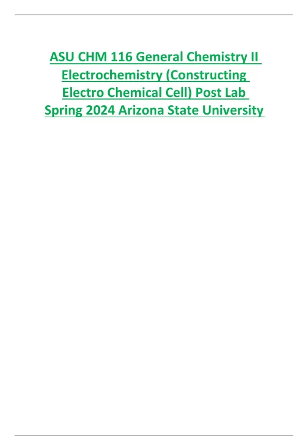 ASU CHM 116 General Chemistry II Electrochemistry (Constructing Electro Chemical Cell) Post Lab Spring 2024 Arizona State University
