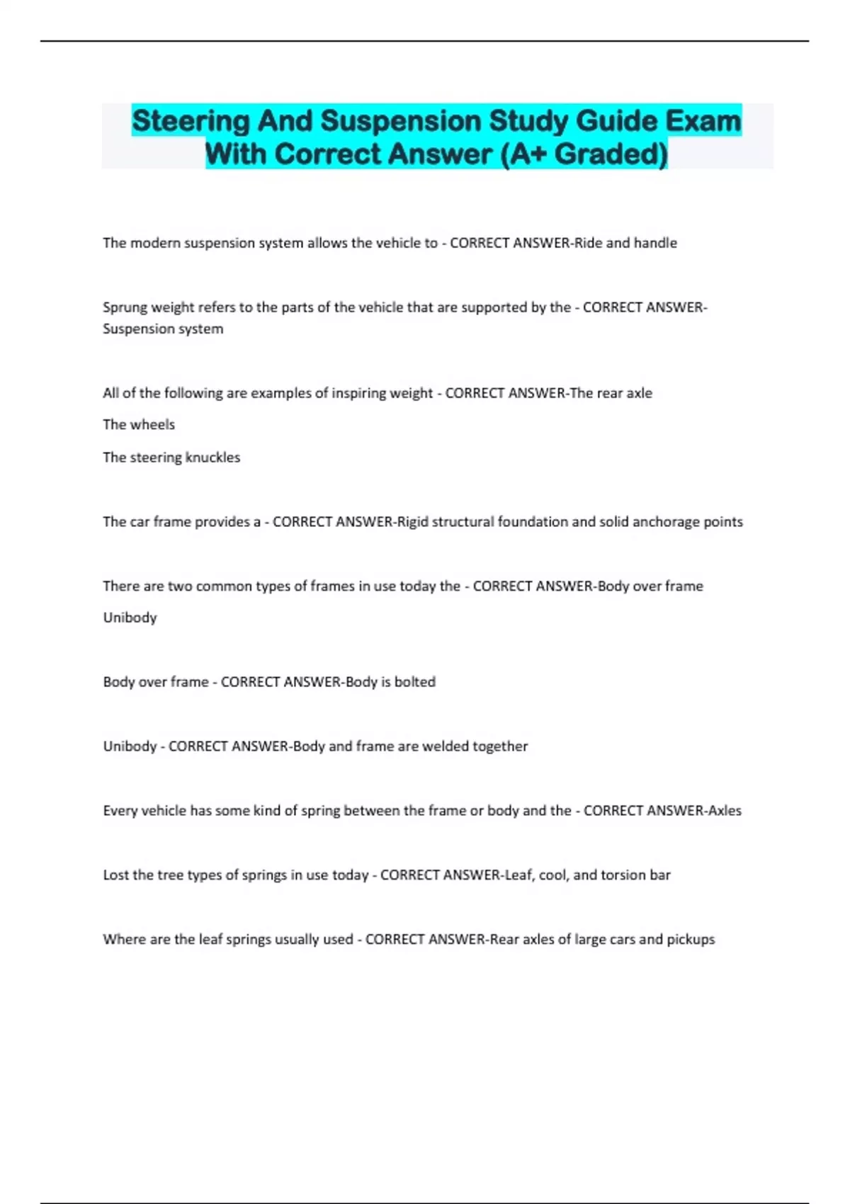 Steering And Suspension Study Guide Exam With Correct Answer (A+ Graded) The modern suspension system allows the vehicle to - CORRECT ANSWER-Ride and handle Sprung weight refers to the parts of the vehicle that are supported by the - CORRECT ANSWERSuspension system All of the following are examples of inspiring weight - CORRECT ANSWER-The rear axle The wheels The steering knuckle