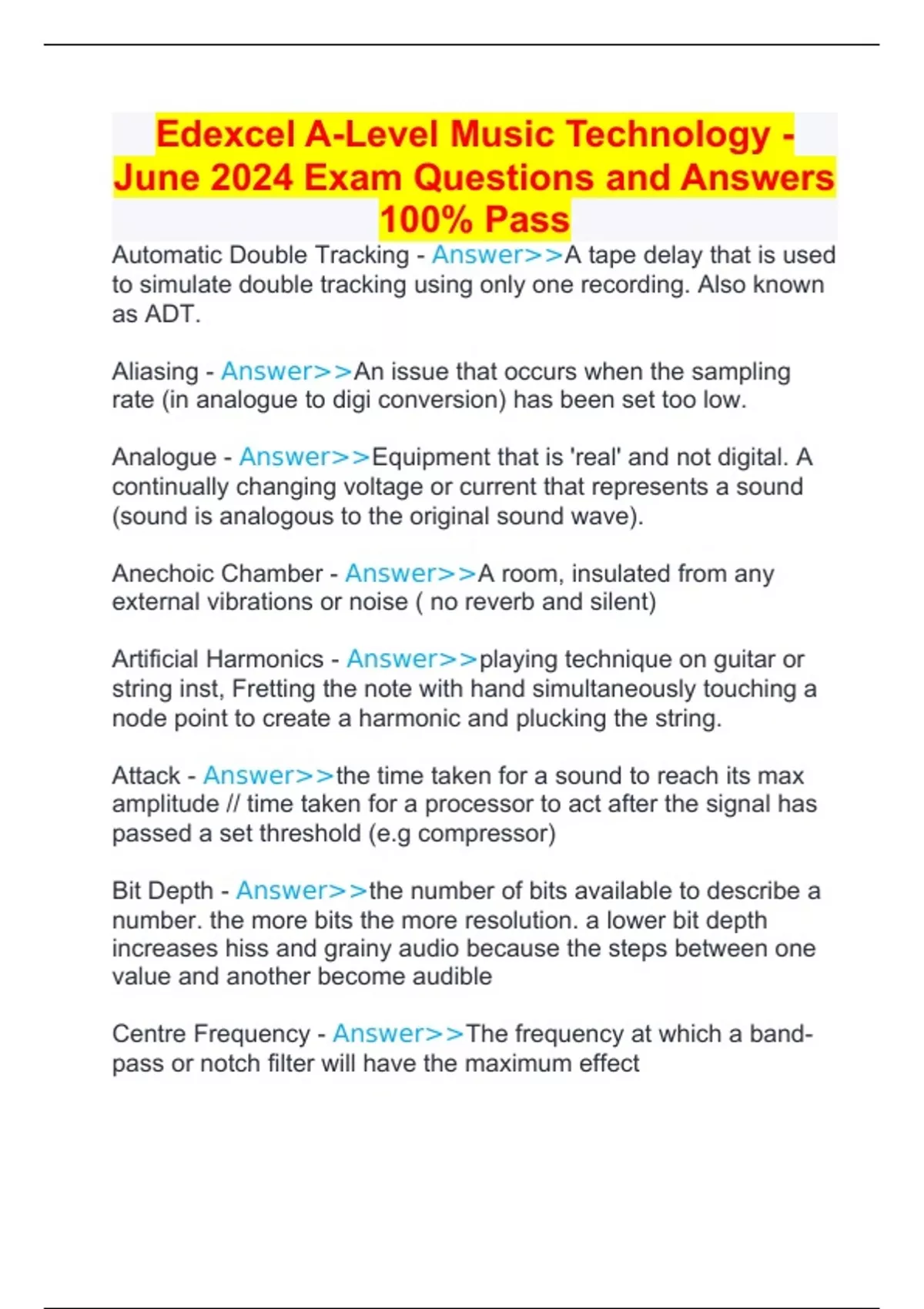 Edexcel A-Level Music Technology -June 2024 Exam Questions and Answers 100% Pass
