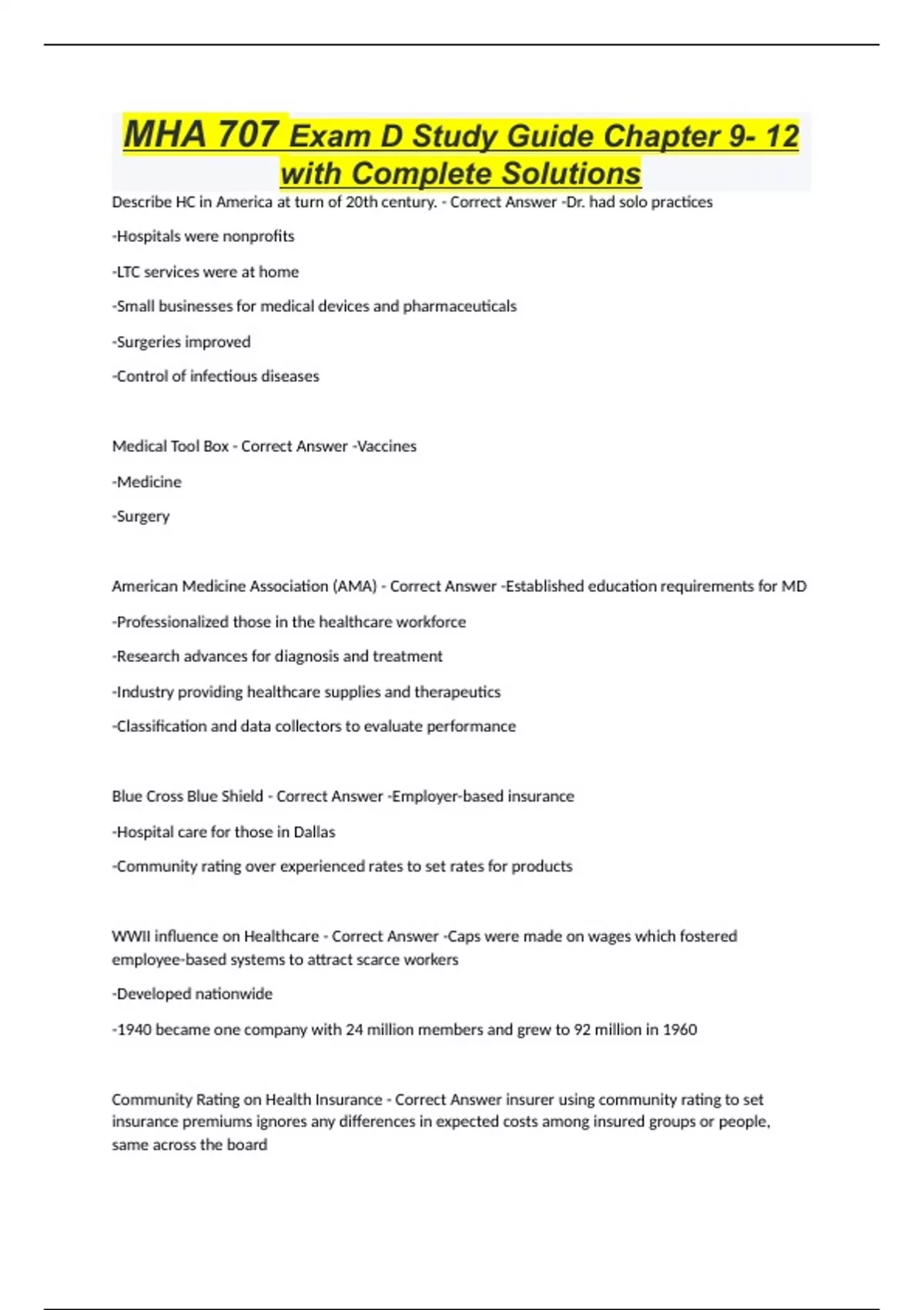 Describe HC in America at turn of 20th century. - Correct Answer -Dr. had solo practices -Hospitals were nonprofits -LTC services were at home -Small businesses for medical devices and pharmaceuticals -Surgeries improved -Control of infectious diseases Medical Tool Box - Correct Answer -Vaccines -Medicine -Surgery American Medicine Association (AMA) - Correct Answer -Established education requirements for MD -Professionalized those in the healthcare workforce -Research advances for diagnosis and treatment -Industry providing healthcare supplies and therapeutics -Classification and data collectors to evaluate performance Blue Cross Blue Shield - Correct Answer -Employer-based insurance -Hospital care for those in Dallas -Community rating over experienced rates to set rates for products WWII influence on Healthcare - Correct Answer -Caps were made on wages which fostered employee-based systems to attract scarce workers -Developed nationwide -1940 became one company with 24 million members and grew to 92 million in 1960 Community Rating on Health Insurance - Correct Answer insurer using community rating to set insurance premiums ignores any differences in expected costs among insured groups or people, same across the board