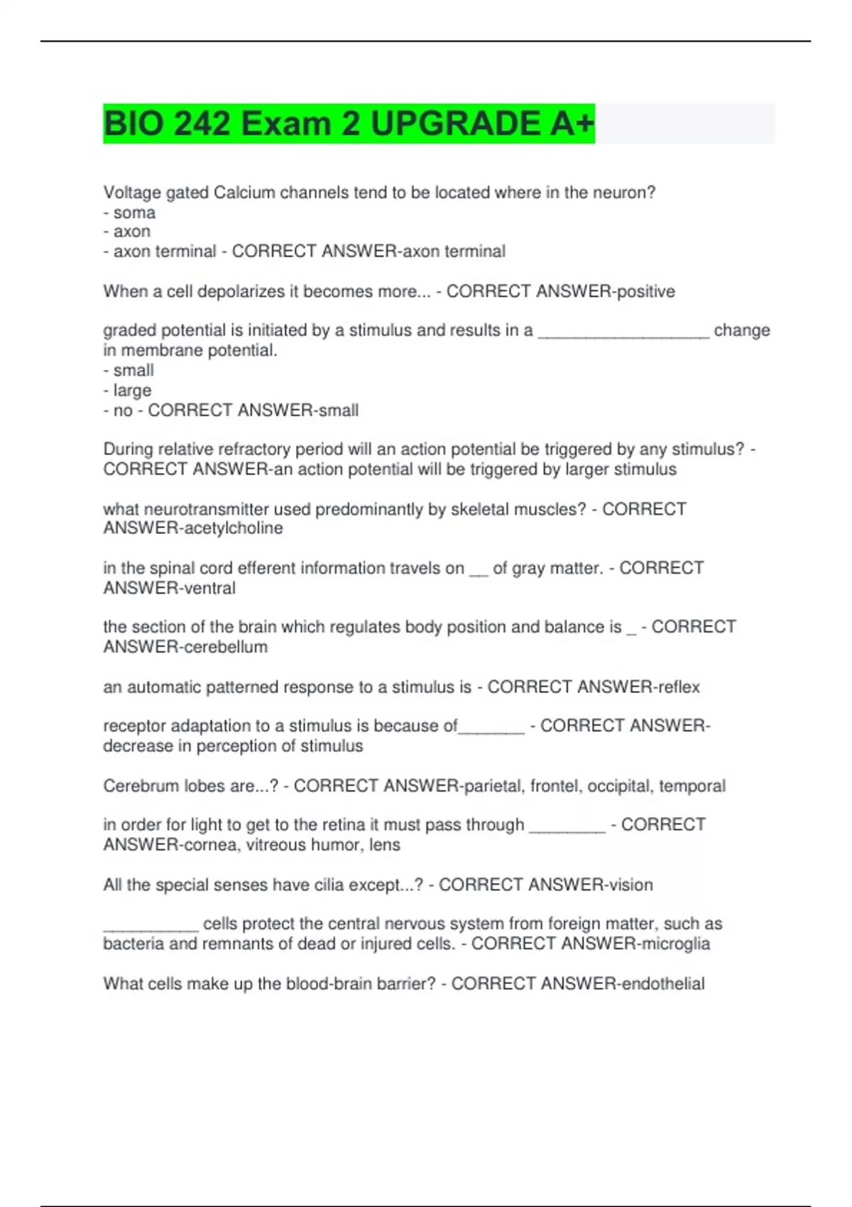 BIO 242 Exam 2 UPGRADE A+ Voltage gated Calcium channels tend to be located where in the neuron? - soma - axon - axon terminal - CORRECT ANSWER-axon terminal When a cell depolarizes it becomes more... - CORRECT ANSWER-positive graded potential is initiated by a stimulus and results in a __________________ change in membrane potential. - small - large - no - CORRECT ANSWER-small During relative refractory period will an action potential be triggered by any stimulus? - CORRECT ANSWER-an action potential will be triggered by larger stimulus what neurotransmitter used predominantly by skeletal muscles? - CORRECT ANSWER-acetylcholine in the spinal cord efferent information travels on __ of gray matter. - CORRECT ANSWER-ventral the section of the brain which regulates body position and balance is _ - CORRECT ANSWER-cerebellum an automatic patterned response to a stimulus is - CORRECT ANSWER-reflex receptor adaptation to a stimulus is because of_______ - CORRECT ANSWERdecrease in perception of stimulus Cerebrum lobes are...? - CORRECT ANSWER-parietal, frontel, occipital, temporal in order for light to get to the retina it must pass through ________ - CORRECT ANSWER-cornea, vitreous humor, lens All the special senses have cilia except...? - CORRECT ANSWER-vision __________ cells protect the central nervous system from foreign matter, such as bacteria and remnants of dead or injured cells. - CORRECT ANSWER-microglia What cells make up the blood-brain barrier? - CORRECT ANSWER-endothelial Which of the following is NOT one of the functions of cerebrospinal fluid (CSF)? a. CSF is important in the synthesis of T-lymphocytes. b. CSF acts as a shock absorber that prevents the soft nervous tissue from colliding with the hard bone. c. CSF functions as the interstitial fluid that bathes neurons and glial cells, providing the necessary nutrients and removing waste products. d. CSF contributes to the normal ionic composition around neurons. - CORRECT ANSWER-CSF is important in the synthesis of T-lymphocytes. The triad of a skeletal muscle cell is formed by what three structures? three transverse tubules two terminal cisternae and one transverse tubule three terminal cisternae two transverse tubules and one terminal cisternae - CORRECT ANSWER-two terminal cisternae and one transverse tubule Which brain tissue contains mostly axons - CORRECT ANSWER-white matter Which of the following structures of the brain functions in motor coordination and balance, providing feedback to motor systems to ensure smooth movements? hypothalamus thalamus cerebellum limbic system - CORRECT ANSWER-cerebellum Which of the following brain structures is involved in regulating sleep-wake cycles? - CORRECT ANSWER-reticular formation What do the sensory receptors for taste, smell, and pain have in common? - The afferent neurons for all three terminate in the occipital lobe of the brain. - The afferent neurons for all three have branches that terminate in the limbic system and can alter behavior. - The receptors for all three are specialized ending of the afferent neurons rather than specialized cells. - They all detect chemicals in fluids. - CORRECT ANSWER-They all detect chemicals in fluids. Once the oxygen has been fully removed from blood, it turns blue. This is why veins appear blue when looking at them just under the skin. True or False - CORRECT ANSWER-False blood is red - arteries = bright red; veins = dark red Which of the following is true regarding electrical activity in pacemaker cells of the heart? - Activation of voltage-gated Ca++ channels are necessary for the cell to reach threshold. - Opening Na+ channels and closing K+ channels causes the pacemaker cells to depolarize to threshold. - At the initiation of depolarization, funny channels are closed. - Closing of K+ channels terminates the action potential. - CORRECT ANSWERActivation of voltage-gated Ca++ channels are necessary for the cell to reach threshold. Which type of sensory receptor is associated with taste, smell, blood oxygen, and blood pH? mechanoreceptors photoreceptors chemoreceptors thermoreceptors - CORRECT ANSWER-chemoreceptors Which of the eye component changes shape as it bends light, so that the light appropriately focuses on the photoreceptors? - CORRECT ANSWER-lens A 19-year-old male goes to the eye doctor because he is unable to see distant objects clearly, but he sees near objects fine. After examining him, the physician explains that his lens or cornea bends the light that enters the eye too much, causing it to focus in front of the retina. This condition is known as __________. - hyperopia - presbyopia - emmetropia - myopia - CORRECT ANSWER-myopia Which structure can change the pupillary diameter to modulate how much light is entering the eye? - CORRECT ANSWER-iris Hearing loss with aging (presbycusis) is relatively common. This is usually due to a combination of causes, such as genes and loud noises. For example, listening to loud music (especially through headphones) or working in very noisy conditions may increase presbycusis. Damage to which signal transduction structures might lead to this hearing loss? - CORRECT ANSWER-stereocilia Which of the following reflexes is a monosynaptic reflex in the human body? salivation reflex pupillary reflex baroreceptor reflex muscle spindle stretch reflex - CORRECT ANSWER-muscle spindle stretch reflex In which portion of the vestibular apparatus are the receptor cells that detect rotational acceleration located? organ of Corti ampulla utricle cochlea - CORRECT ANSWER-ampulla