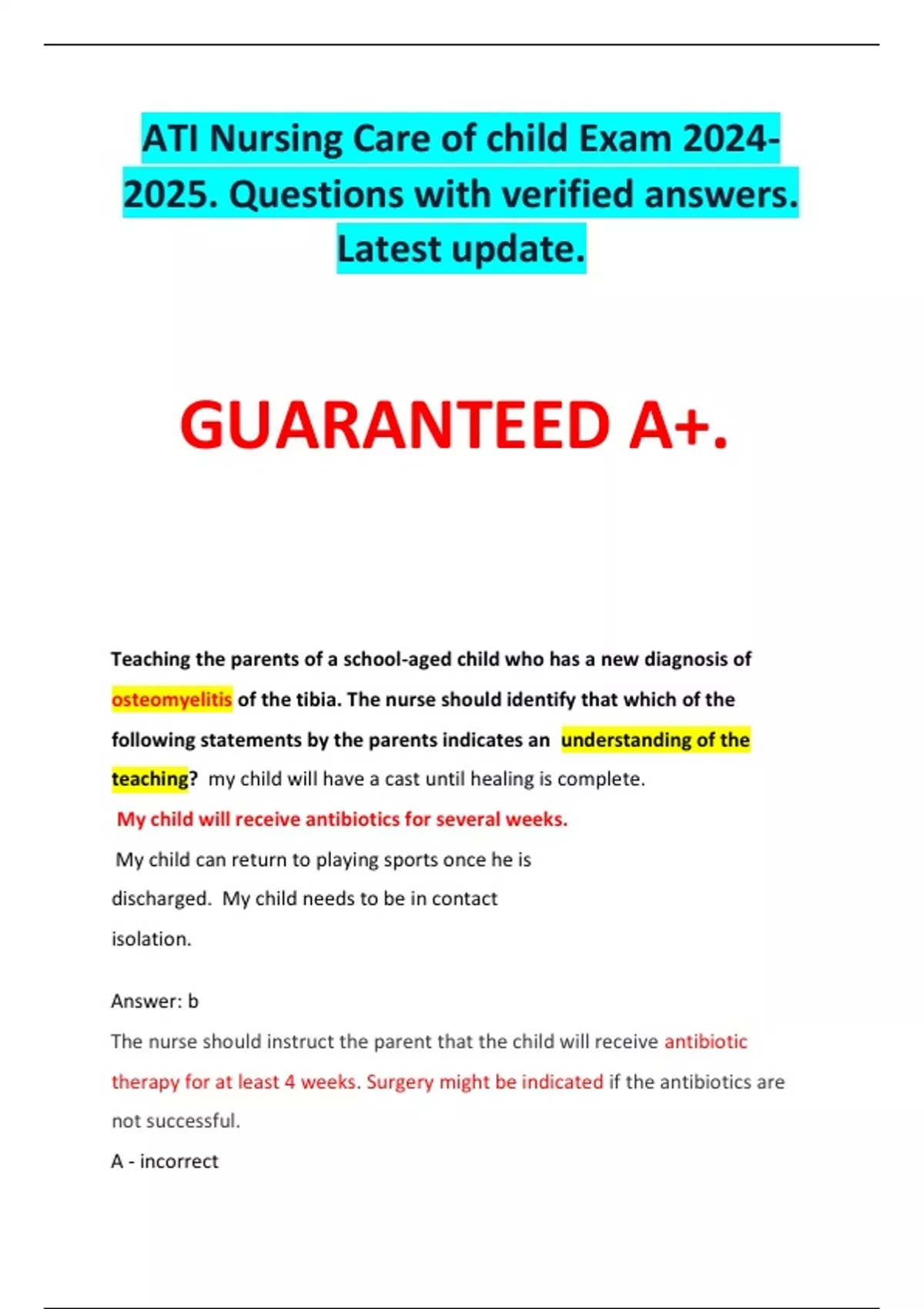 ATI Nursing Care of child Exam . Questions with verified answers. Latest update. GUARANTEED A+. Teaching the parents of a school-aged child who has a new diagnosis of osteomyelitis of the tibia. The nurse should identify that which of the following statements by the parents indicates an understanding of the teaching? my child will have a cast until healing is complete. My child will receive antibiotics for several weeks. My child can return to playing sports once he is discharged. My child needs to be in contact isolation. Answer: b The nurse should instruct the parent that the child will receive antibiotic therapy for at least 4 weeks. Surgery might be indicated if the antibiotics are not successful. A - incorrect Weight bearing must be avoided with osteomyelitis. Therefore, the child is placed in a comfortable position with the limb supported. There is no indication for a cast. C- incorrect Weight bearing should be avoided to prevent complications and minimize pain. Therefore, it will be several weeks to months before the child can play contact sports. D- incorrect Contact isolation is NOT necessary, because osteomyelitis is not a communicable illness. A nurse is auscultating the lungs of an adolescent who has asthma. The nurse should identify the sound as which of the following? Click the audio button to listen. A- Biots respiration B- Chaney Stokes respiration C- tackypnea D - Bradypnea Answer- c The nurse should identify the sound heard during auscultation as tachypnea, which is a rapid, regular breathing pattern. This breathing pattern often occurs with anxiety, fever, metabolic acidosis, or severe anemia. A- Biot's respirations are periods of apnea alternating with two or three shallow breaths. B- Cheyne-Stokes respirations are periods of apnea alternating with periods of hyperventilation. D- Bradypnea is a slow, regular breathing pattern. anaphylactic reaction A nurse in an emergency department is caring for a school-age child who is experiencing an . Which of the following is the priority action by the nurse? A- Elevate the head of the child's bed B- insert a large-bore IV catheter for the child C- determine the allergen that caused the child's reaction D- administer IM epinephrine to the child Answer- d When using the urgent vs nonurgent approach to client care, the nurse determines that the priority action is administering IM epinephrine to the child. During an anaphylactic reaction, histamine release causes bronchoconstriction and vasodilation. This is an emergency because ultimately it causes decreased blood return to the heart. A- Elevating the head of the child's bed is important to facilitate breathing and circulation. However, it is not the priority action the nurse should take. B- Inserting a large bore IV catheter is important to facilitate administration of IV fluids and medications. However, it is not the priority action the nurse should take. C- Determining the allergen that caused the child's reaction is important to prevent any additional episodes of anaphylaxis. However, it is not the priority action the nurse should take. immunization to a four-year-old child The nurse is preparing to administer an . Which of the following actions should the nurse plan to take? A- Place the child in a prone position for the immunization B- request that the child's caregiver leave the room during the immunization C- administer the immunization using a 24 gauge needle D- inject the immunization slowly after aspirating for 3 seconds Answer - c