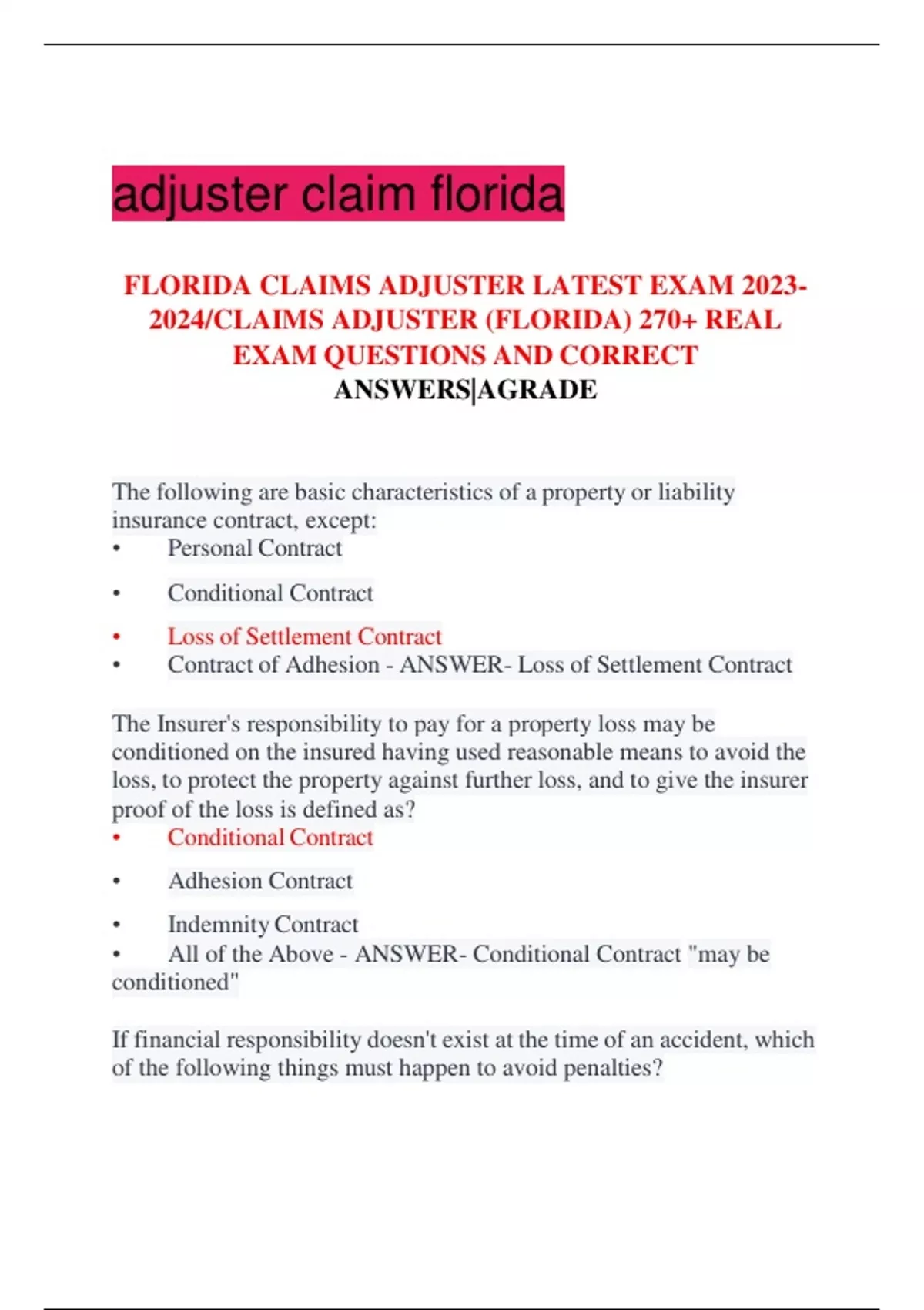 FLORIDA CLAIMS ADJUSTER LATEST EXAM CLAIMS ADJUSTER (FLORIDA) 270+ REAL EXAM QUESTIONS AND CORRECT ANSWERS AGRADE