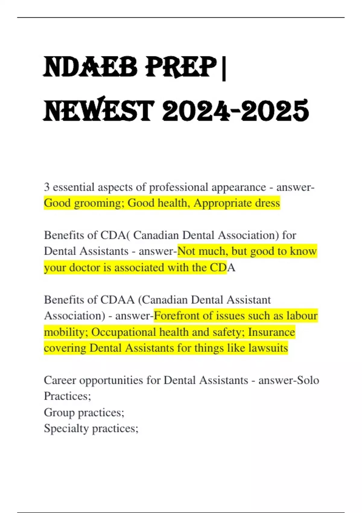 NDAEB PREP| NEWEST 3 essential aspects of professional appearance - answer- Good grooming; Good health, Appropriate dress Benefits of CDA( Canadian Dental Association) for Dental Assistants - answer-Not much, but good to know your doctor is associated with the CDA Benefits of CDAA (Canadian Dental Assistant Association) - answer-Forefront of issues such as labour mobility; Occupational health and safety; Insurance covering Dental Assistants for things like lawsuits Career opportunities for Dental Assistants - answer-Solo Practices; Group practices; Specialty practices; Office managers; Financial coordinators; Scheduling coordinators; Public health dentistry (schools and clinics); Hospitals; Dental Schools CCOHS (Canadian Centre for Occupational Health and Safety) Mission - answer-All Canadians have a right to a healthy and safe work environment, free of work-related illness and injury. They provide relevant and credible tools to improve workplace health and safety programs. CDA - answer-Canadian Dental Association What are the benefits of the ODAA (Ontario Dental Assistant Association) - answer-Allows you to share your questions and knowledge with other dental assistants; Provides resources for research and new knowledge in the dental industry; Looks good on a resume (possibly requirement); Discounts What does CCOHS stand for - answer-Canadian Centre for Occupational Health and Safety
