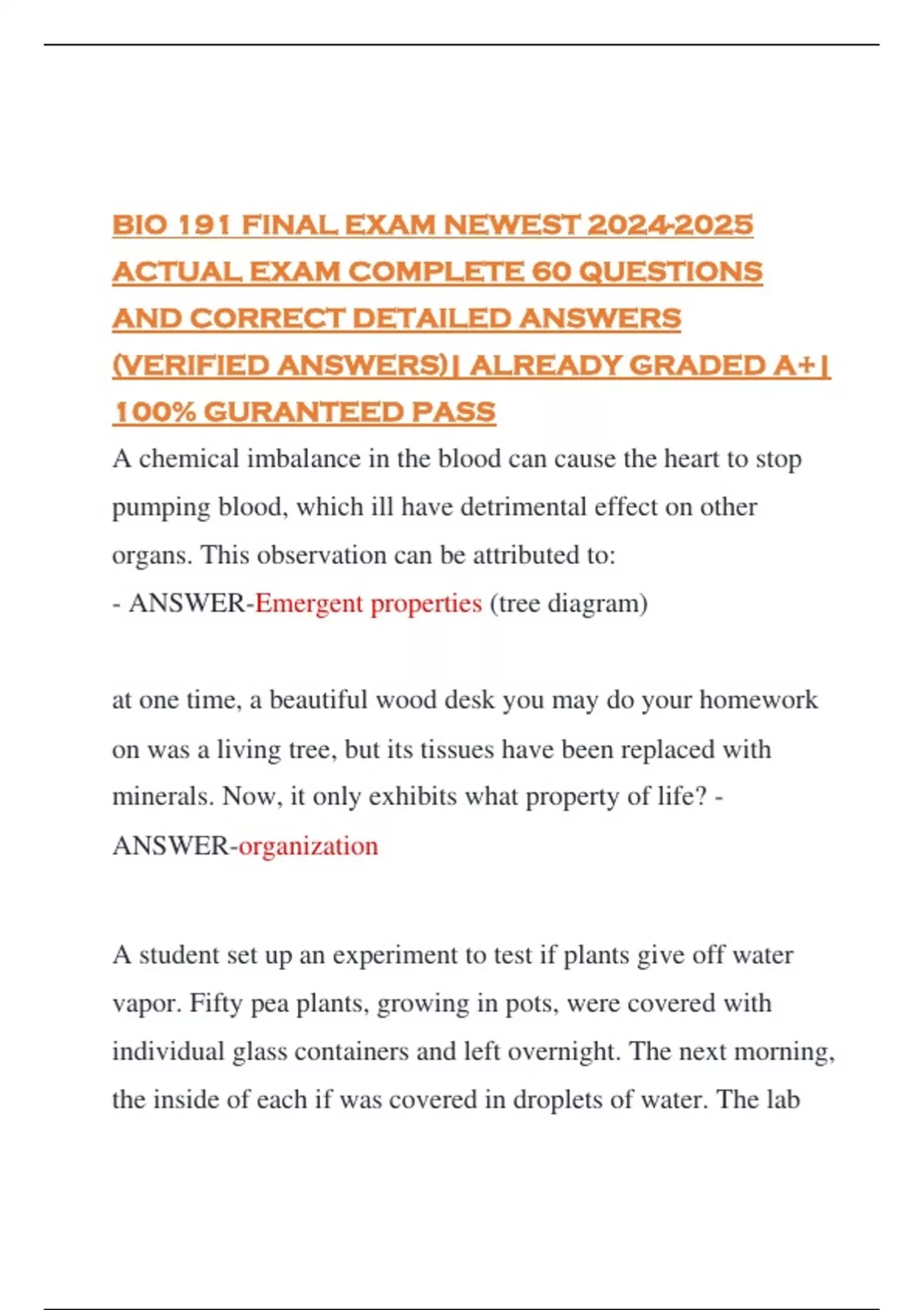 BIO 191 FINAL EXAM NEWEST ACTUAL EXAM COMPLETE 60 QUESTIONS AND CORRECT DETAILED ANSWERS (VERIFIED ANSWERS)| ALREADY GRADED A+| 100% GURANTEED PASS A chemical imbalance in the blood can cause the heart to stop pumping blood, which ill have detrimental effect on other organs. This observation can be attributed to: - ANSWER-Emergent properties (tree diagram) at one time, a beautiful wood desk you may do your homework on was a living tree, but its tissues have been replaced with minerals. Now, it only exhibits what property of life? - ANSWER-organization A student set up an experiment to test if plants give off water vapor. Fifty pea plants, growing in pots, were covered with individual glass containers and left overnight. The next morning, the inside of each if was covered in droplets of water. The lab student concluded that plants generally give off water vapor. What critique would you make of the experimental design? - ANSWER-There was no control so the water could have come other sources such as air in the jar or the soil An alien from another planet landed on earth. He is fascinated by cars and is determined to figure out how they work. He decides to disassemble one of them and examine each part independently. He removes one of the tires and proceeds to learn all he can about the tire. He then removes one of the headlights and proceeds to learn all he can about the headlight. What type of approach is this alien taking to learn about the car? - ANSWER-reductionism You have been assigned to analyze some extraterrestrial material recently collected from Mars. After examining a sample using a microscope you jump up excitedly and shout to your colleagues that you have confirmed the existence of life on Mars. One of your colleagues takes a look at your sample and remarks that all he sees is a single-celled "blob" with little internal structure. Assuming that life on Mars can be classified into similar domains and kingdoms as Earth, to which domain does your "blob" belong? - ANSWER-Archaea If two different species of fish fossils were found in two different layers of sedimentary rock, what might one infer about the specimens? - ANSWER-the species in lower layer died first