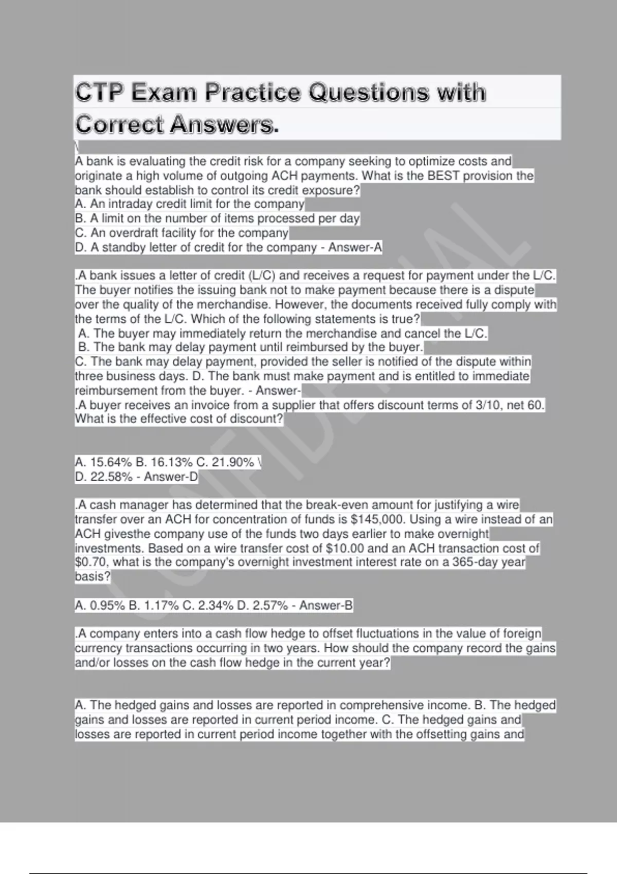 CTP Exam Practice Questions with Correct Answers. A bank is evaluating the credit risk for a company seeking to optimize costs and originate a high volume of outgoing ACH payments. What is the BEST provision the bank should establish to control its credit exposure? A. An intraday credit limit for the company B. A limit on the number of items processed per day C. An overdraft facility for the company D. A standby letter of credit for the company - Answer-A .A bank issues a letter of credit (L/C) and receives a request for payment under the L/C. The buyer notifies the issuing bank not to make payment because there is a dispute over the quality of the merchandise. However, the documents received fully comply with the terms of the L/C. Which of the following statements is true? A. The buyer may immediately return the merchandise and cancel the L/C. B. The bank may delay payment until reimbursed by the buyer. C. The bank may delay payment, provided the seller is notified of the dispute within three business days. D. The bank must make payment and is entitled to immediate reimbursement from the buyer. - Answer- .A buyer receives an invoice from a supplier that offers discount terms of 3/10, net 60. What is the effective cost of discount? A. 15.64% B. 16.13% C. 21.90% D. 22.58% - Answer-D .A cash manager has determined that the break-even amount for justifying a wire transfer over an ACH for concentration of funds is $145,000. Using a wire instead of an ACH givesthe company use of the funds two days earlier to make overnight investments. Based on a wire transfer cost of $10.00 and an ACH transaction cost of $0.70, what is the company's overnight investment interest rate on a 365-day year basis? A. 0.95% B. 1.17% C. 2.34% D. 2.57% - Answer-B .A company enters into a cash flow hedge to offset fluctuations in the value of foreign currency transactions occurring in two years. How should the company record the gains and/or losses on the cash flow hedge in the current year? A. The hedged gains and losses are reported in comprehensive income. B. The hedged gains and losses are reported in current period income. C. The hedged gains and losses are reported in current period income together with the offsetting gains and