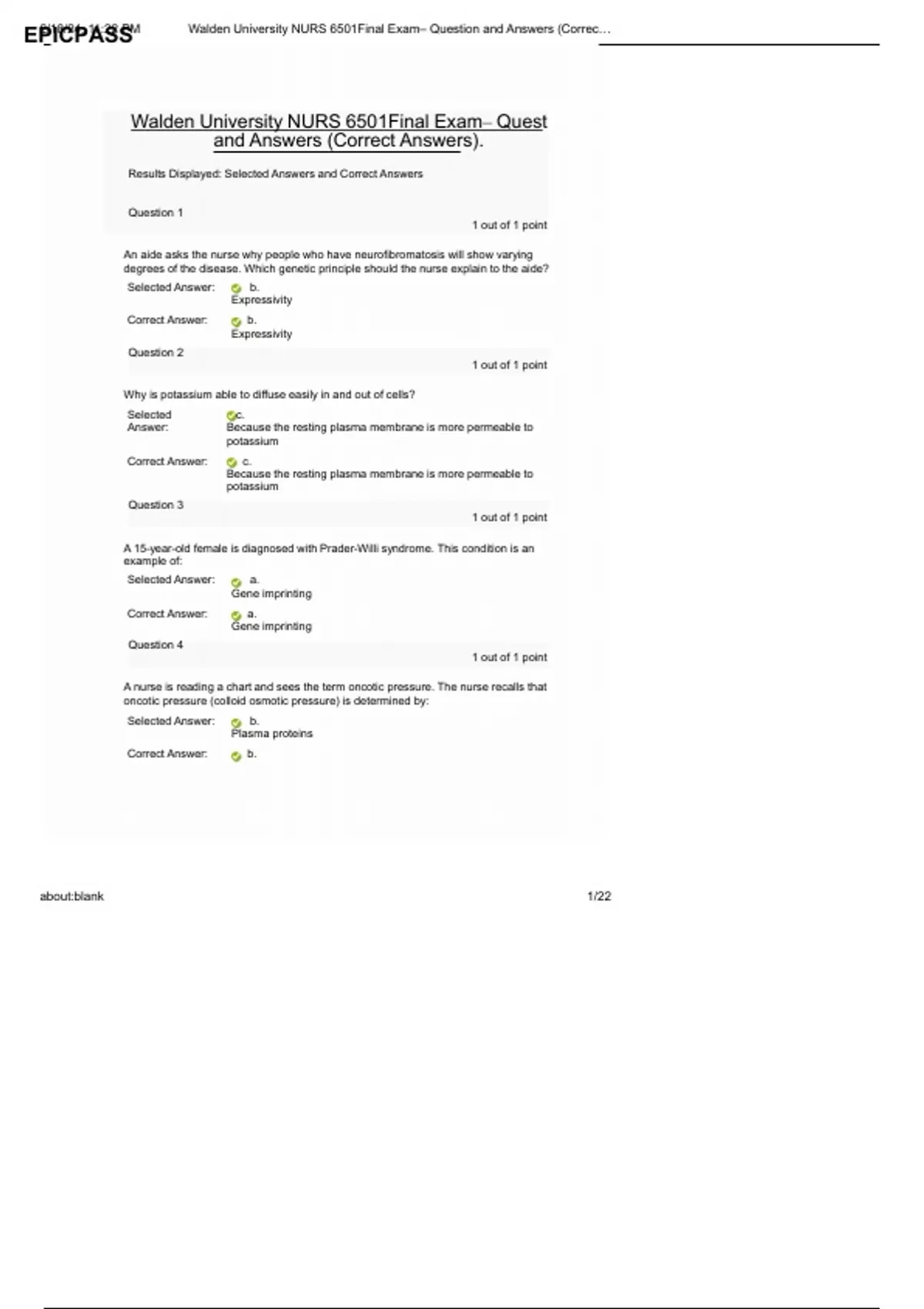 Genetic Principle - Expressivity: Question: Why do people with neurofibromatosis show varying degrees of the disease? Answer: The nurse should explain the concept of expressivity, which describes how the severity of a genetic condition can vary among individuals with the same genotype. Potassium Diffusion in Cells: Question: Why is potassium able to diffuse easily in and out of cells? Answer: Potassium diffuses easily because the resting plasma membrane is more permeable to potassium compared to other ions. Prader-Willi Syndrome - Gene Imprinting: Question: Prader-Willi syndrome in a 15-year-old female is an example of what genetic phenomenon? Answer: This condition is an example of gene imprinting, where certain genes are expressed in a parent-specific manner. Oncotic Pressure (Colloid Osmotic Pressure): Question: What determines oncotic pressure in the blood? Answer: Oncotic pressure is primarily determined by plasma proteins, which help maintain fluid balance across cell membranes.