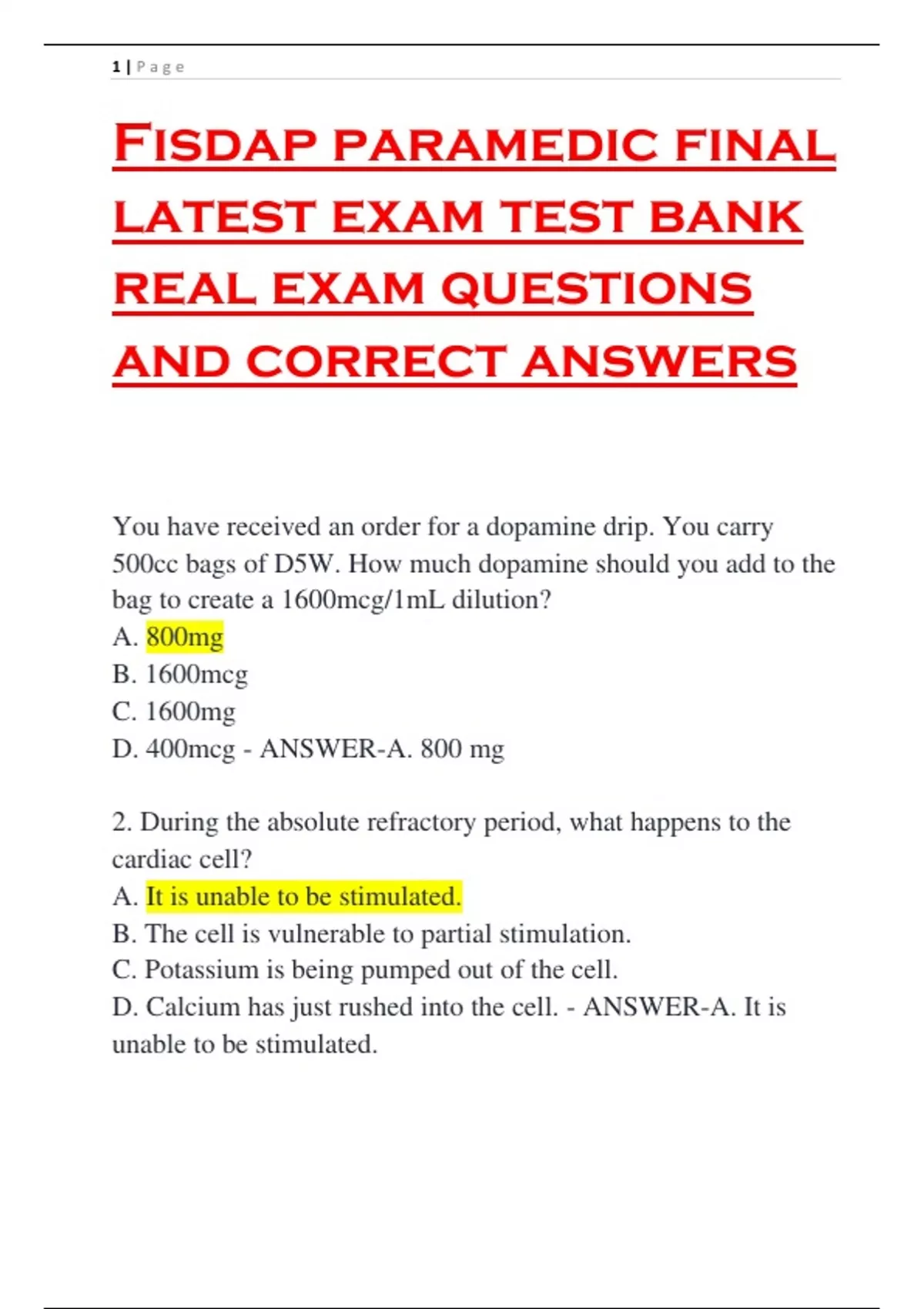 Fisdap paramedic final latest exam test bank real exam questions and correct answers You have received an order for a dopamine drip. You carry 500cc bags of D5W. How much dopamine should you add to the bag to create a 1600mcg/1mL dilution? A. 800mg B. 1600mcg C. 1600mg D. 400mcg - ANSWER-A. 800 mg 2. During the absolute refractory period, what happens to the cardiac cell? A. It is unable to be stimulated. B. The cell is vulnerable to partial stimulation. C. Potassium is being pumped out of the cell. D. Calcium has just rushed into the cell. - ANSWER-A. It is unable to be stimulated. 2 | P a g e 3. A 29 year old female fell from an 18 foot roof. During your rapid trauma assessment, where are you most likely to find lifethreatening injuries? A. Head, neck, extremities B. Head, chest, abdomen C. Abdomen, pelvis, arms D. Chest, pelvis, extremities - ANSWER-B. Head, chest, abdomen 4. Unequal pupils are a result of pressure on which structure? A. Central medulla B. Trochlear membrane C. Vagus nerve D. Occulomotor nerve - ANSWER-D. Occulomotor nerve 5. What is an abnormally high level of carbon dioxide in the blood called? A. Pneumonia B. Hypoxia C. Hypercapnia D. Emphysema - ANSWER-C. Hypercapnia 6. What is oxygen deficiency in the body called? A. Hypercarbia B. Hyperoxia C. Hypoxia D. Hypoxemia - ANSWER-C. Hypoxia