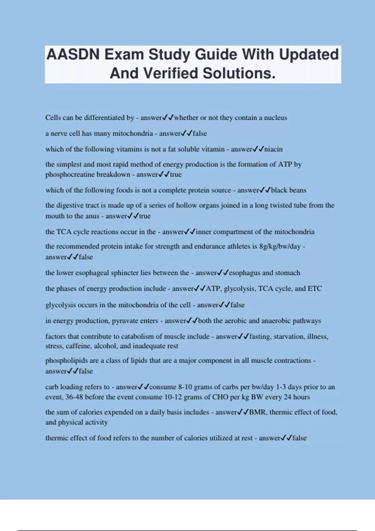 AASDN Exam Study Guide With Updated And Verified Solutions. Cells can be differentiated by - answerwhether or not they contain a nucleus a nerve cell has many mitochondria - answerfalse which of the following vitamins is not a fat soluble vitamin - answerniacin the simplest and most rapid method of energy production is the formation of ATP by phosphocreatine breakdown - answertrue which of the following foods is not a complete protein source - answerblack beans the digestive tract is made up of a series of hollow organs joined in a long twisted tube from the mouth to the anus - answertrue the TCA cycle reactions occur in the - answerinner compartment of the mitochondria the recommended protein intake for strength and endurance athletes is 8g/kg/bw/day - answerfalse the lower esophageal sphincter lies between the - answeresophagus and stomach the phases of energy production include - answerATP, glycolysis, TCA cycle, and ETC glycolysis occurs in the mitochondria of the cell - answerfalse in energy production, pyruvate enters - answerboth the aerobic and anaerobic pathways factors that contribute to catabolism of muscle include - answerfasting, starvation, illness, stress, caffeine, alcohol, and inadequate rest phospholipids are a class of lipids that are a major component in all muscle contractions - answerfalse carb loading refers to - answerconsume 8-10 grams of carbs per bw/day 1-3 days prior to an event, 36-48 before the event consume 10-12 grams of CHO per kg BW every 24 hours the sum of calories expended on a daily basis includes - answerBMR, thermic effect of food, and physical activity thermic effect of food refers to the number of calories utilized at rest - answerfalse specialization of 3 segments of the small intestines allows for absorption of nutrients in different areas along the small intestines - answertrue a stroke occurs when - answera clot blocks the blood supply to the brain or when a blood vessel in or around the brain burtsts some of the most important treatable risk factors for stroke include - answerhypertension, cigarette smoking, heart disease, warning signs or history of TIA, diabetes, physical inactivity, and obesity a major role of cholesterol is - answermodulating membrane fluidity a large substantial proportion of cancers could be prevented by eliminating cell phone usage, microwave usage, and computer usage - answerfalse all cancers involve the malfunction of genes that control cell growth and division - answertrue at least 21 studies have found an inverse relationship between physical activity and lung cancer risk - answertrue BG homeostasis is regulated primarily by the hormones - answerinsulin, glucagon, epinephrine and norepinephrine which of the following is not a non-insulin dependent cell - answerfat cell the pancreas produces - answera wide variety of enzymes that breakdown CHO, fats and proteins absorbed fatty acids and CHO are reassembled and transported throughout the body via - answerlipoproteins the exogenous pathway for lipoprotein metabolism refers to - answerchylomicrons that are secreted from the intestinal epithelial cells into the lymphatic system steroids are organic compounds derived from the 17 carbon atoms composed of 4 rings - answertrue one should avoid eating fish bc of the PCBs and mercury found in all types of fish - answerfalse the hormone in the small intestines that signals the gal bladder to release bile (which emulsifies fat) is - answercholecytokinin the two essential fatty acids are eicosanoids and prostaglandins - answerfalse essential fatty acids function to hold oxygen in cell membranes where they act as a barrier to foreign organisms - answertrue