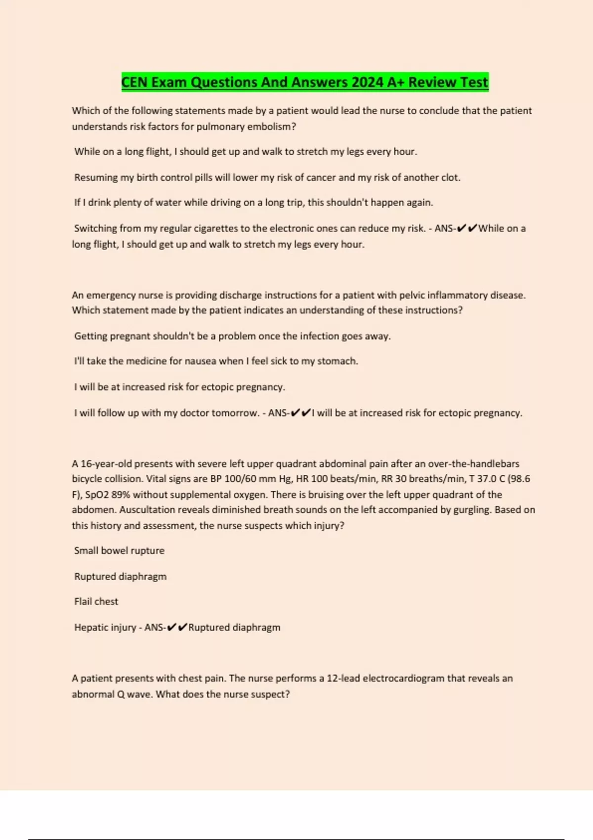 CEN Exam Questions And Answers 2024 A+ Review Test Which of the following statements made by a patient would lead the nurse to conclude that the patient understands risk factors for pulmonary embolism? While on a long flight, I should get up and walk to stretch my legs every hour. Resuming my birth control pills will lower my risk of cancer and my risk of another clot. If I drink plenty of water while driving on a long trip, this shouldn't happen again. Switching from my regular cigarettes to the electronic ones can reduce my risk. - ANS-While on a long flight, I should get up and walk to stretch my legs every hour. An emergency nurse is providing discharge instructions for a patient with pelvic inflammatory disease. Which statement made by the patient indicates an understanding of these instructions? Getting pregnant shouldn't be a problem once the infection goes away. I'll take the medicine for nausea when I feel sick to my stomach. I will be at increased risk for ectopic pregnancy. I will follow up with my doctor tomorrow. - ANS-I will be at increased risk for ectopic pregnancy. A 16-year-old presents with severe left upper quadrant abdominal pain after an over-the-handlebars bicycle collision. Vital signs are BP 100/60 mm Hg, HR 100 beats/min, RR 30 breaths/min, T 37.0 C (98.6 F), SpO2 89% without supplemental oxygen. There is bruising over the left upper quadrant of the abdomen. Auscultation reveals diminished breath sounds on the left accompanied by gurgling. Based on this history and assessment, the nurse suspects which injury? Small bowel rupture Ruptured diaphragm Flail chest Hepatic injury - ANS-Ruptured diaphragm A patient presents with chest pain. The nurse performs a 12-lead electrocardiogram that reveals an abnormal Q wave. What does the nurse suspect? Continues...