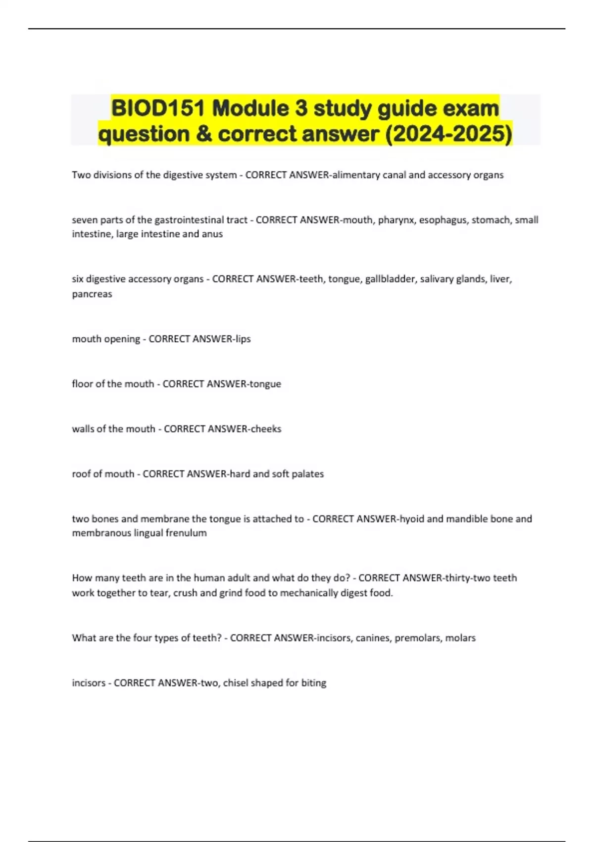 BIOD151 Module 3 study guide exam question & correct answer () Two divisions of the digestive system - CORRECT ANSWER-alimentary canal and accessory organs seven parts of the gastrointestinal tract - CORRECT ANSWER-mouth, pharynx, esophagus, stomach, small intestine, large intestine and anus six digestive