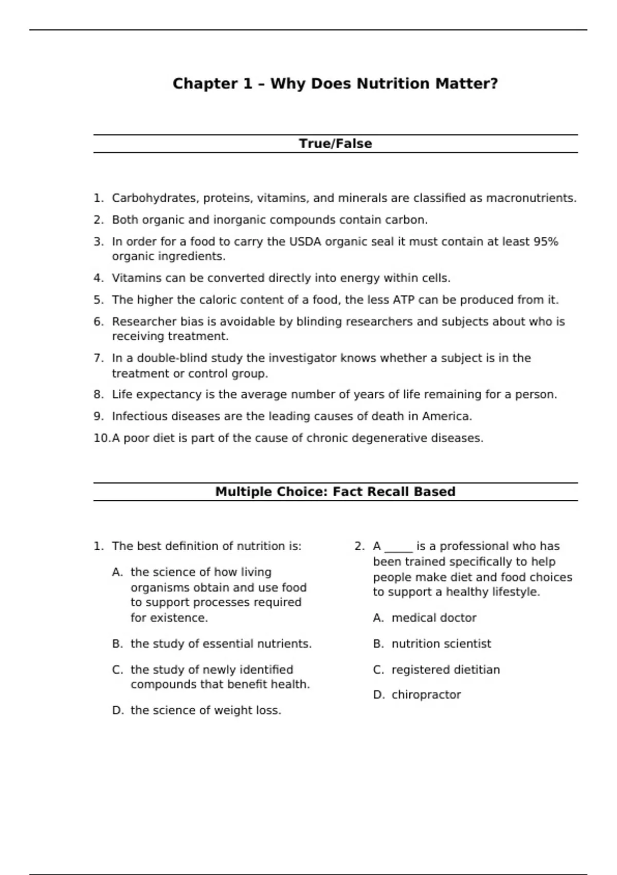 1. The best definition of nutrition is: 2. A _____ is a professional who has