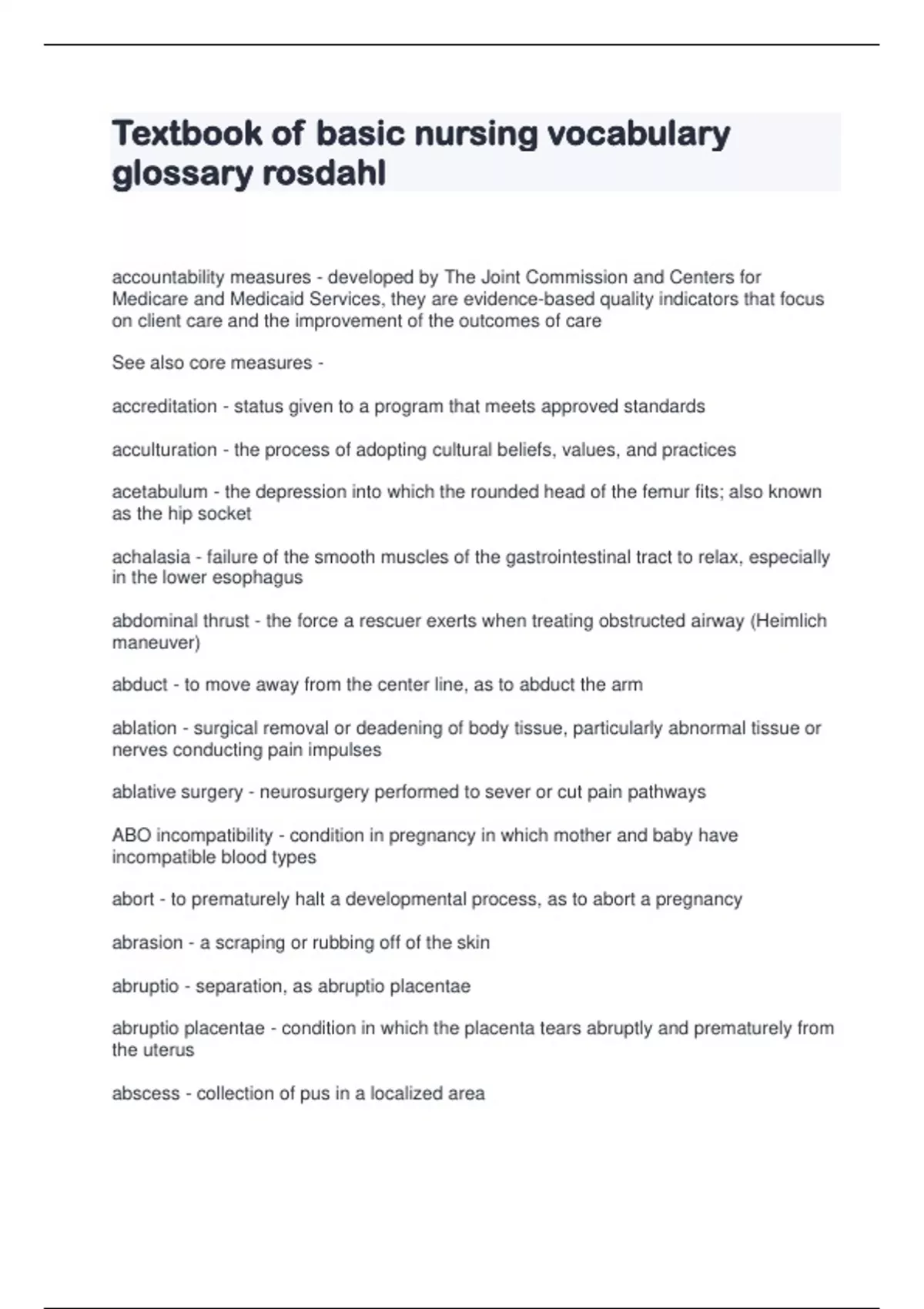 Textbook of basic nursing vocabulary glossary rosdahl accountability measures - developed by The Joint Commission and Centers for Medicare and Medicaid Services, they are evidence-based quality indicators that focus on client care and the improvement of the outcomes of care See also core measures - accreditation - status given to a program that meets approved standards acculturation - the process of adopting cultural beliefs, values, and practices acetabulum - the depression into which the rounded head of the femur fits; also known as the hip socket achalasia - failure of the smooth muscles of the gastrointestinal tract to relax, especially in the lower esophagus abdominal thrust - the force a rescuer exerts when treating obstructed airway (Heimlich maneuver) abduct - to move away from the center line, as to abduct the arm ablation - surgical removal or deadening of body tissue, particularly abnormal tissue or nerves conducting pain impulses ablative surgery - neurosurgery performed to sever or cut pain pathways ABO incompatibility - condition in pregnancy in which mother and baby have incompatible blood types abort - to prematurely halt a developmental process, as to abort a pregnancy abrasion - a scraping or rubbing off of the skin abruptio - separation, as abruptio placentae abruptio placentae - condition in which the placenta tears abruptly and prematurely from the uterus abscess - collection of pus in a localized area absorption - transfer of food into the cardiovascular circulation for transport A1c - a test that measures average blood sugar accommodation - adjustment, as the accommodation of the lens of the eye accountability - responsibility for all actions that one performs acid - chemical compound with a pH below 7 acidosis - pathology resulting from acid accumulation or alkali depletion
