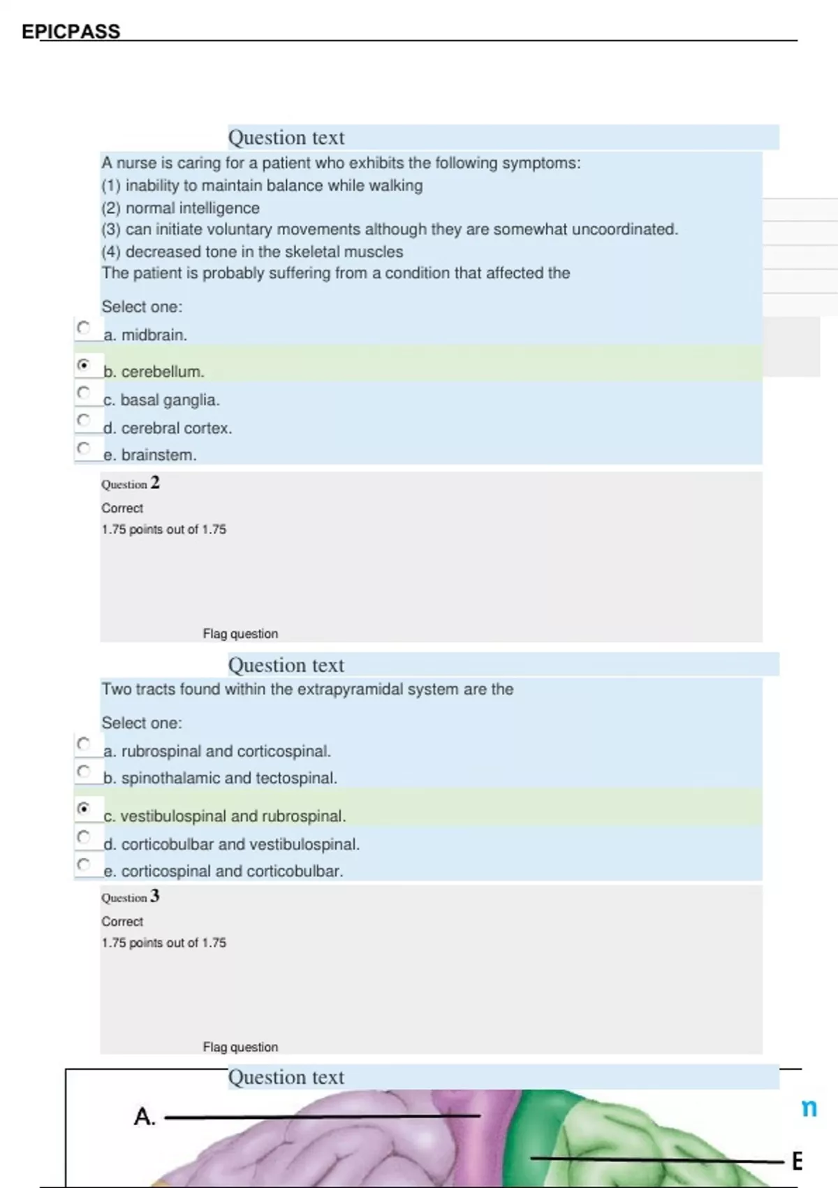 Integration of Nervous System Functions Newly Updated 2023 Question text Question text Question text Question 3 Correct 1.75 points out of 1.75 Flag question d. corticobulbar and vestibulospinal. e. corticospinal and corticobulbar. c. vestibulospinal and rubrospinal. a. rubrospinal and corticospinal. b. spinothalamic and tectospinal. Two tracts found within the extrapy