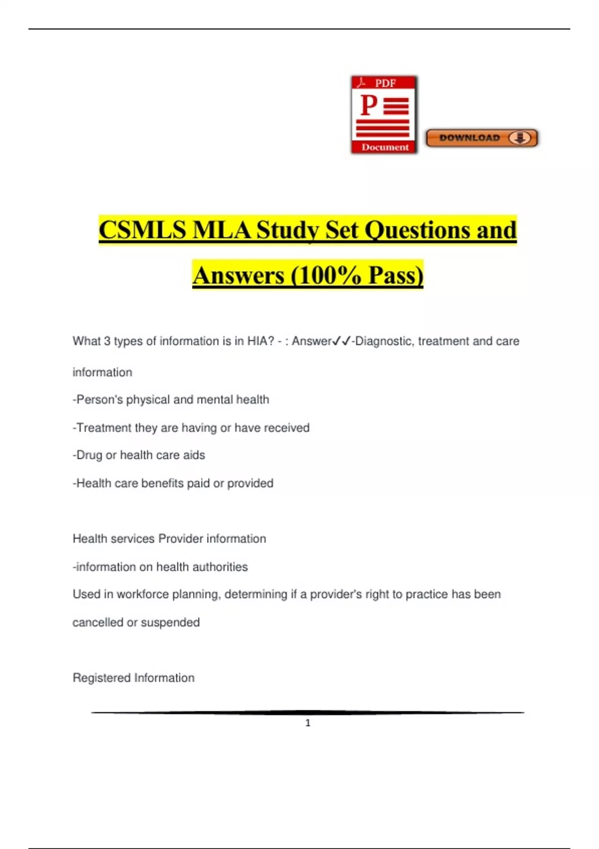 csmls mla study set questions and answers 100 pa