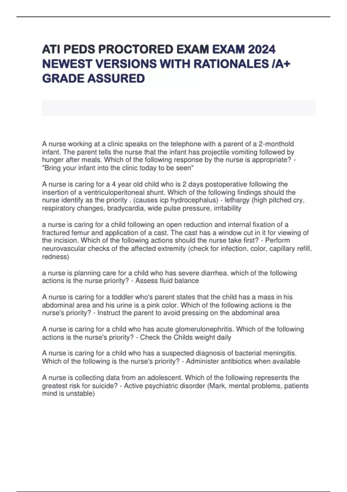 ATI PEDS PROCTORED EXAM EXAM 2024 NEWEST VERSIONS WITH RATIONALES /A+ GRADE ASSURED A nurse working at a clinic speaks on the telephone with a parent of a 2-monthold infant. The parent tells the nurse that the infant has projectile vomiting followed by hunger after meals. Which of the following response by the nurse is appropriate? - "Bring your infant into the clinic today to be seen" A nurse is caring for a 4 year old child who is 2 days postoperative following the insertion of a ventriculoperitoneal shunt. Which of the following findings should the nurse identify as the priority . (causes icp hydrocephalus) - lethargy (high pitched cry, respiratory changes, bradycardia, wide pulse pressure, irritability a nurse is caring for a child following an open reduction and internal fixation of a fractured femur and application of a cast. The cast has a window cut in it for viewing of the incision. Which of the following actions should the nurse take first? - Perform neurovascular checks of the affected extremity (check for infection, color, capillary refill, redness) a nurse is planning care for a child who has severe diarrhea. which of the following actions is the nurse priority? - Assess fluid balance A nurse is caring for a toddler who's parent states that the child has a mass in his abdominal area and his urine is a pink color. Which of the following actions is the nurse's priority? - Instruct the parent to avoid pressing on the abdominal area A nurse is caring for a child who has acute glomerulonephritis. Which of the following actions is the nurse's priority? - Check the Childs weight daily A nurse is caring for a child who has a suspected diagnosis of bacterial meningitis. Which of the following is the nurse's priority? - Administer antibiotics when available A nurse is collecting data from an adolescent. Which of the following represents the greatest risk for suicide? - Active psychiatric disorder (Mark, mental problems, patients mind is unstable) A nurse is collecting data from an infant who has otitis media (middle ear infection). The nurse should expect which of the following findings? - Tugging on the affected ear lobe