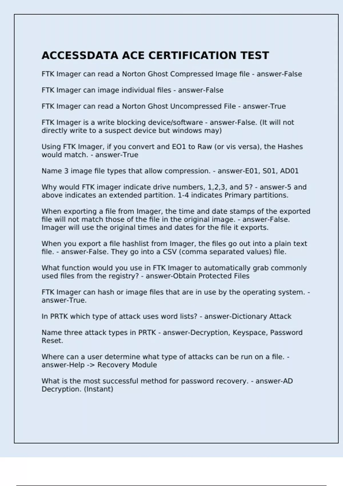 FTK Imager can read a Norton Ghost Compressed Image file - answer-False FTK Imager can image individual files - answer-False FTK Imager can read a Norton Ghost Uncompressed File - answer-True FTK Imager is a write blocking device/software - answer-False. (It will not directly write to a suspect device but windows may) Using FTK Imager, if you convert and EO1 to Raw (or vis versa), the Hashes would match. - answer-True Name 3 image file types that allow compression. - answer-E01, S01, AD01 Why would FTK imager indicate drive numbers, 1,2,3, and 5? - answer-5 and above indicates an extended partition. 1-4 indicates Primary partitions. When exporting a file from Imager, the time and date stamps of the exported file will not match those of the file in the original image. - answer-False. Imager will use the original times and dates for the file it exports. When you export a file hashlist from Imager, the files go out into a plain text file. - answer-False. They go into a CSV (comma separated values) file. What function would you use in FTK Imager to automatically grab commonly used files from the registry? - answer-Obtain Protected Files FTK Imager can hash or image files that are in use by the operating system. - answer-True. In PRTK which type of attack uses word lists? - answer-Dictionary Attack Name three attack types in PRTK - answer-Decryption, Keyspace, Password Reset. Where can a user determine what type of attacks can be run on a file. - answer-Help -> Recovery Module What is the most successful method for password recovery. - answer-AD Decryption. (Instant) What 3 parts comprise an attack profile? - answer-Languages, Dictionaries, Levels. What happens to a file's hash value when it is decrypted - answer-It changes. How would you view all the graphics in a case in FTK - answer-Select the root of the evdence tree and enable the quick picks for it.