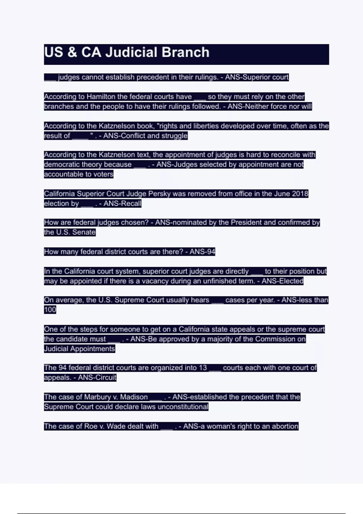 US & CA Judicial Branch Questions with 100% Actual correct answers | verified | latest update | Graded A+ | Already Passed | Complete Solution