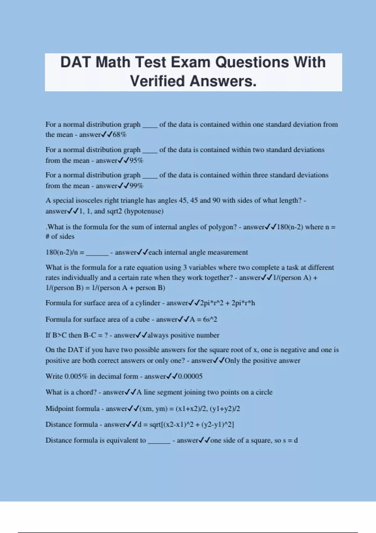 DAT Math Test Exam Questions With Verified Answers. For a normal distribution graph ____ of the data is contained within one standard deviation from the mean - answer68% For a normal distribution graph ____ of the data is contained within two standard deviations from the mean - answer95% For a normal distribution graph ____ of the data is contained within three standard deviations from the mean - answer99% A special isosceles right triangle has angles 45, 45 and 90 with sides of what length? - answer1, 1, and sqrt2 (hypotenuse) .What is the formula for the sum of internal angles of polygon? - answer180(n-2) where n = # of sides 180(n-2)/n = ______ - answereach internal angle measurement What is the formula for a rate equation using 3 variables where two complete a task at different rates individually and a certain rate when they work together? - answer1/(person A) + 1/(person B) = 1/(person A + person B) Formula for surface area of a cylinder - answer2pi*r^2 + 2pi*r*h Formula for surface area of a cube - answerA = 6s^2 If B>C then B-C = ? - answeralways positive number On the DAT if you have two possible answers for the square root of x, one is negative and one is positive are both correct answers or only one? - answerOnly the positive answer Write 0.005% in decimal form - answer0.00005 What is a chord? - answerA line segment joining two points on a circle Midpoint formula - answer(xm, ym) = (x1+x2)/2, (y1+y2)/2 Distance formula - answerd = sqrt[(x2-x1)^2 + (y2-y1)^2] Distance formula is equivalent to ______ - answerone side of a square, so s = d