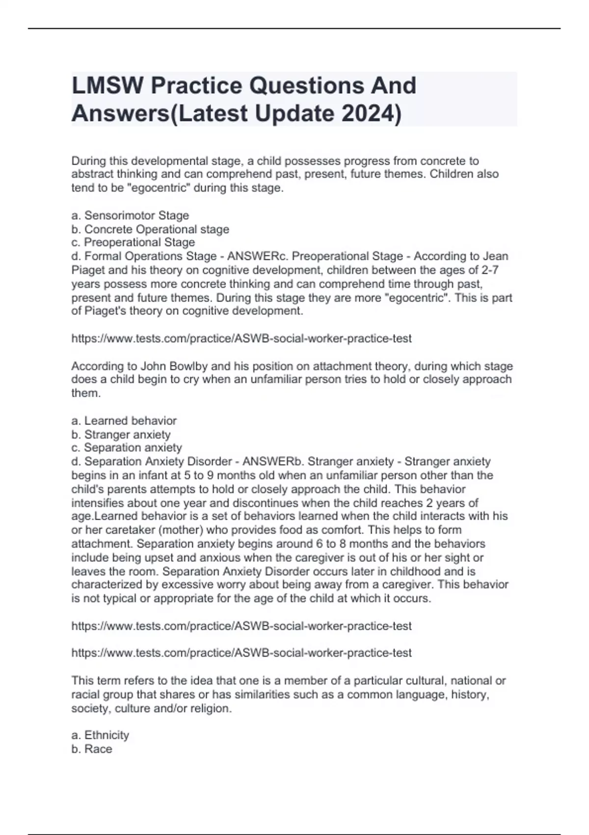 During this developmental stage, a child possesses progress from concrete to abstract thinking and can comprehend past, present, future themes. Children also tend to be "egocentric" during this stage. a. Sensorimotor Stage b. Concrete Operational stage c. Preoperational Stage d. Formal Operations Stage - ANSWERc. Preoperational Stage - According to Jean Piaget and his theory on cognitive development, children between the ages of 2-7 years possess more concrete thinking and can comprehend time through past, present and future themes. During this stage they are more "egocentric". This is part of Piaget's theory on cognitive development. According to John Bowlby and his position on attachment theory, during which stage does a child begin to cry when an unfamiliar person tries to hold or closely approach them. a. Learned behavior b. Stranger anxiety c. Separation anxiety d. Separation Anxiety Disorder - ANSWERb. Stranger anxiety - Stranger anxiety begins in an infant at 5 to 9 months old when an unfamiliar person other than the child's parents attempts to hold or closely approach the child. This behavior intensifies about one year and discontinues when the child reaches 2 years of age.Learned behavior is a set of behaviors learned when the child interacts with his or her caretaker (mother) who provides food as comfort. This helps to form attachment. Separation anxiety begins around 6 to 8 months and the behaviors include being upset and anxious when the caregiver is out of his or her sight or leaves the room. Separation Anxiety Disorder occurs later in childhood and is characterized by excessive worry about being away from a caregiver. This behavior is not typical or appropriate for the age of the child at which it occurs. This term refers to the idea that one is a member of a particular cultural, national or racial group that shares or has similarities such as a common language, history, society, culture and/or religion. a. Ethnicity b. Race c. Cultural identity d. C