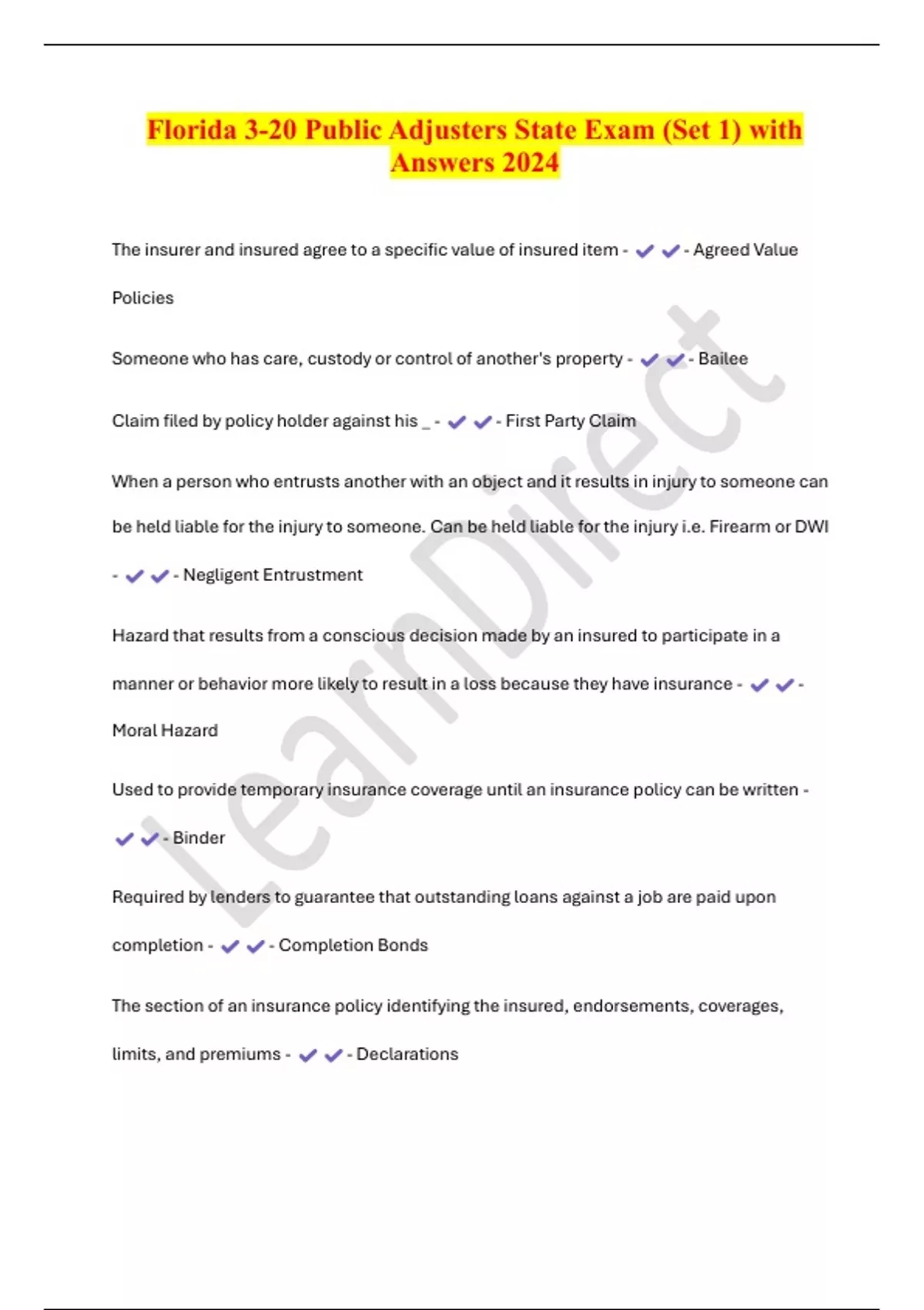 Florida 3-20 Public Adjusters State Exam (Set 1) with Answers 2024 The insurer and insured agree to a specific value of insured item - - Agreed Value Policies Someone who has care, custody or control of another's property - - Bailee Claim filed by policy holder against his _ - - First Party Claim When a person who entrusts another with an object and it results in injury to someone can be held liable for the injury to someone. Can be held liable for the injury i.e. Firearm or DWI - - Negligent Entrustment Hazard that results from a conscious decision made by an insured to participate in a manner or behavior more likely to result in a loss because they have insurance - - Moral Hazard Used to provide temporary insurance coverage until an insurance policy can be written - - Binder Required by lenders to guarantee that outstanding loans against a job are paid upon completion - - Completion Bonds The section of an insurance policy identifying the insured, endorsements, coverages, limits, and premiums - - Declar
