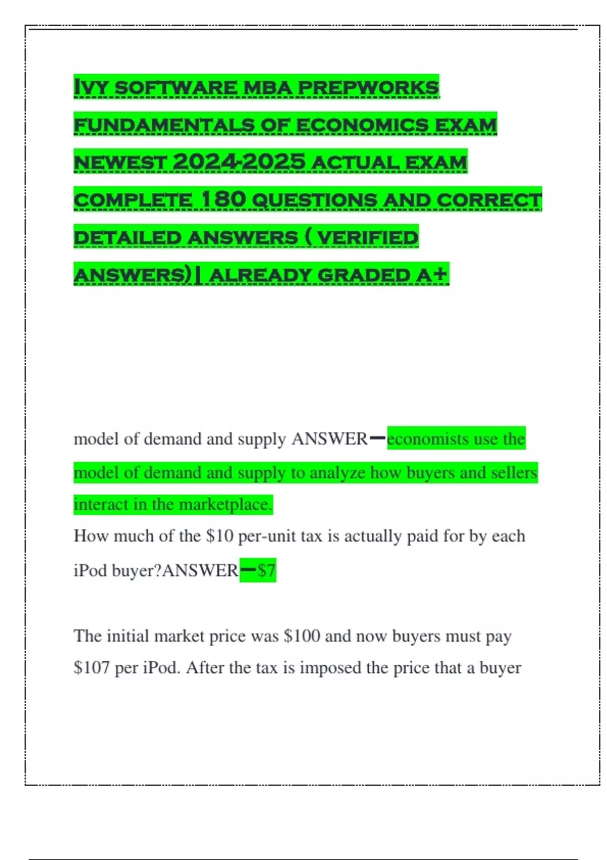 Ivy software mba prepworks fundamentals of economics exam newest actual exam complete 180 questions and correct detailed answers ( verified answers)| already graded a+ model of demand and supply ANSWEReconomists use the model of demand and supply to analyze how buyers and sellers interact in the marketplace. How much of the $10 per-unit tax is actually paid for by each iPod buyer?ANSWER$7 The initial market price was $100 and now buyers must pay $107 per iPod. After the tax is imposed the price that a buyer must pay per iPod increases by $7. Thus, the buyers pay $7 of the per unit cost. How much of the $10 per-unit tax is actually paid for by the sellers of iPods?ANSWER$3 Suppose that the $10 per iPod tax on buyers is repealed. And instead, the government imposes a new law requiring each seller to pay $10 per-iPod tax to the government, ceteris paribus. How much of the $10 per-unit tax is actually paid for by each iPod buyer?ANSWER$7