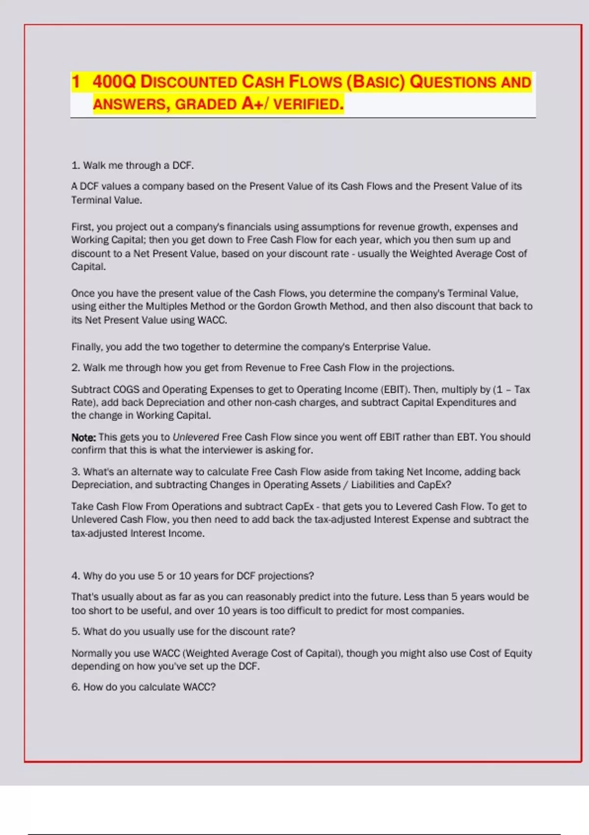 DISCOUNTED CASH FLOWS (BASIC) QUESTIONS AND ANSWERS, GRADED A+/ VERIFIED. 1. Walk me through a DCF. A DCF values a company based on the Present Value of its Cash Flows and the Present Value of its Terminal Value. First, you project out a company's financials using assumptions for revenue growth, expenses and Working Capital; then you get down to Free Cash Flow for each year, which you then sum up and discount to a Net Present Value, based on your discount rate - usually the Weighted Average Cost of Capital. Once you have the present value of the Cash Flows, you determine the company's Terminal Value, using either the Multiples Method or the Gordon Growth Method, and then also discount that back to its Net Present Value using WACC. Finally, you add the two together to determine the company's Enterprise Value. 2. Walk me through how you get from Revenue to Free Cash Flow in the projections. Subtract COGS and Operating Expenses to get to Operating Income (EBIT). Then, multiply by (1 – Tax Rate), add back Depreciation and other non-cash charges, and subtract Capital Expenditures and the change in Working Capital. Note: This gets you to Unlevered Free Cash Flow since you went off EBIT rather than EBT. You should confirm that this is what the interviewer is asking for. 3. What's an alternate way to calculate Free Cash Flow aside from taking Net Income, adding back Depreciation, and subtracting Changes in Operating Assets / Liabilities and CapEx? Take Cash Flow From Operations and subtract CapEx - that gets you to Levered Cash Flow. To get to Unlevered Cash Flow, you then need to add back the tax-adjusted Interest Expense and subtract the tax-adjusted Interest Income. 4. Why do you use 5 or 10 years for DCF projections? That's usually about as far as you can reasonably predict into the future. Less than 5 years would be too short to be useful, and over 10 years is too difficult to predict for most companies. 5. What do you usually use for the discount rate?