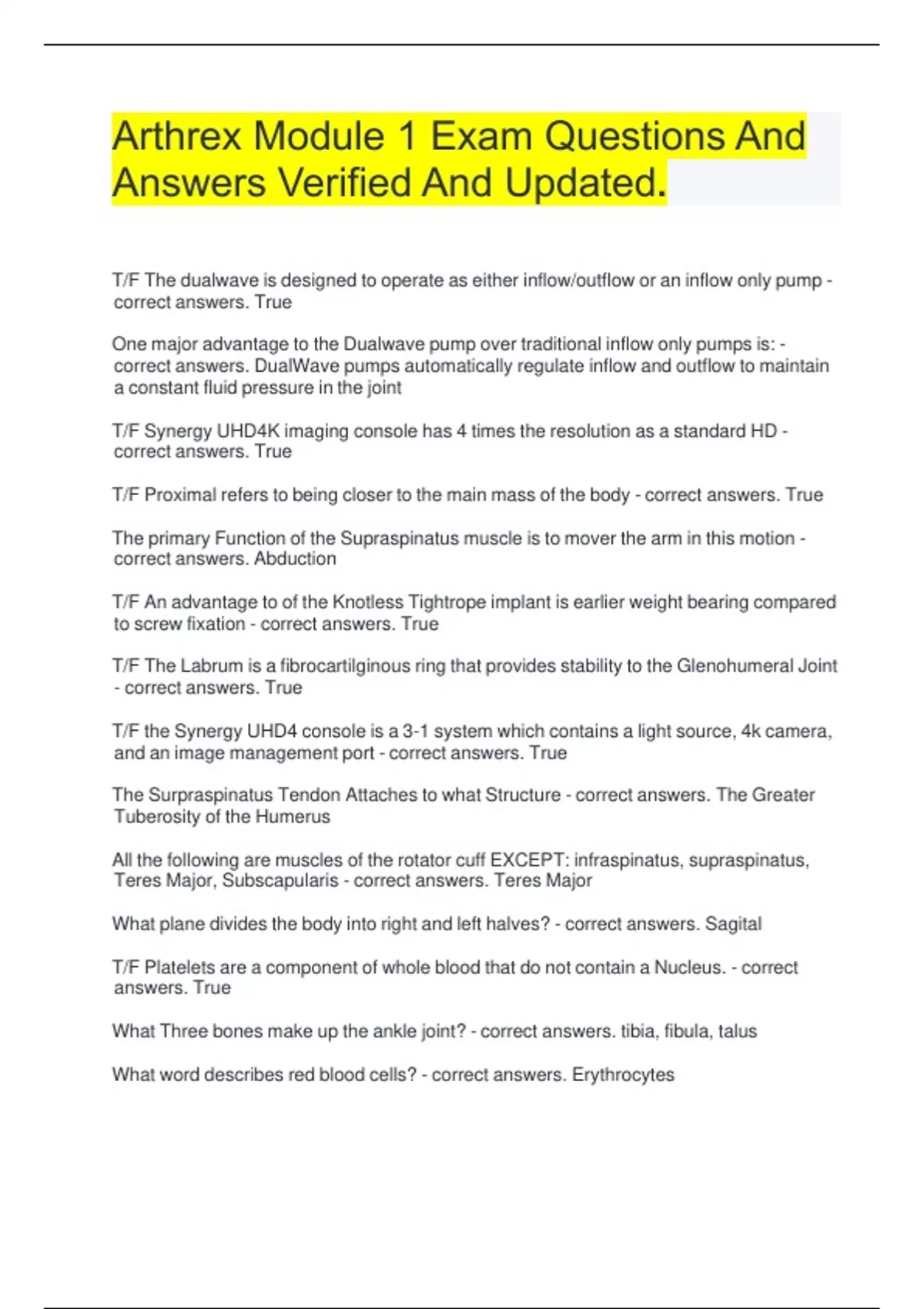 Arthrex Module 1 Exam Questions And Answers Verified And Updated. T/F tThe tdualwave tis tdesigned tto toperate tas teither tinflow/outflow tor tan tinflow tonly tpump t- tcorrect tanswers. tTrue One tmajor tadvantage tto tthe tDualwave tpump tover ttraditional tinflow tonly tpumps tis: t- tcorrect tanswers. tDualWave tpumps tautomatically tregulate tinflow tand toutflow tto tmaintain ta tconstant tfluid tpressure tin tthe tjoint T/F tSynergy tUHD4K timaging tconsole thas t4 ttimes tthe tresolution tas ta tstandard tHD t- tcorrect tanswers. tTrue T/F tProximal trefers tto tbeing tcloser tto tthe tmain tmass tof tthe tbody t- tcorrect tanswers. tTrue The tprimary tFunction tof tthe tSupraspinatus tmuscle tis tto tmover tthe tarm tin tthis tmotion t- tcorrect tanswers. tAbduction T/F tAn tadvantage tto tof tthe tKnotless tTightrope timplant tis tearlier tweight tbearing tcompared tto tscrew tfixation t- tcorrect tanswers. tTrue T/F tThe tLabrum tis ta tfibrocartilginous tring tthat tprovides tstability tto tthe tGlenohumeral tJoint t- tcorrect tanswers. tTrue T/F tthe tSynergy tUHD4 tconsole tis ta t3-1 tsystem twhich tcontains ta tlight tsource, t4k tcamera, tand tan timage tmanagement tport t- tcorrect tanswers. tTrue The tSurpraspinatus tTendon tAttaches tto twhat tStructure t- tcorrect tanswers. tThe tGreater tTuberosity tof tthe tHumerus All tthe tfollowing tare tmuscles tof tthe trotator tcuff tEXCEPT: tinfraspinatus, tsupraspinatus, tTeres tMajor, tSubscapularis t- tcorrect tanswers. tTeres tMajor What tplane tdivides tthe tbody tinto tright tand tleft thalves? t- tcorrect tanswers. tSagital T/F tPlatelets tare ta tcomponent tof twhole tblood tthat tdo tnot tcontain ta tNucleus. t- tcorrect tanswers. tTrue What tThree tbones tmake tup tthe tankle tjoint? t- tcorrect tanswers. ttibia, tfibula, ttalus What tword tdescribes tred tblood tcells? t- tcorrect tanswers. tErythrocytes