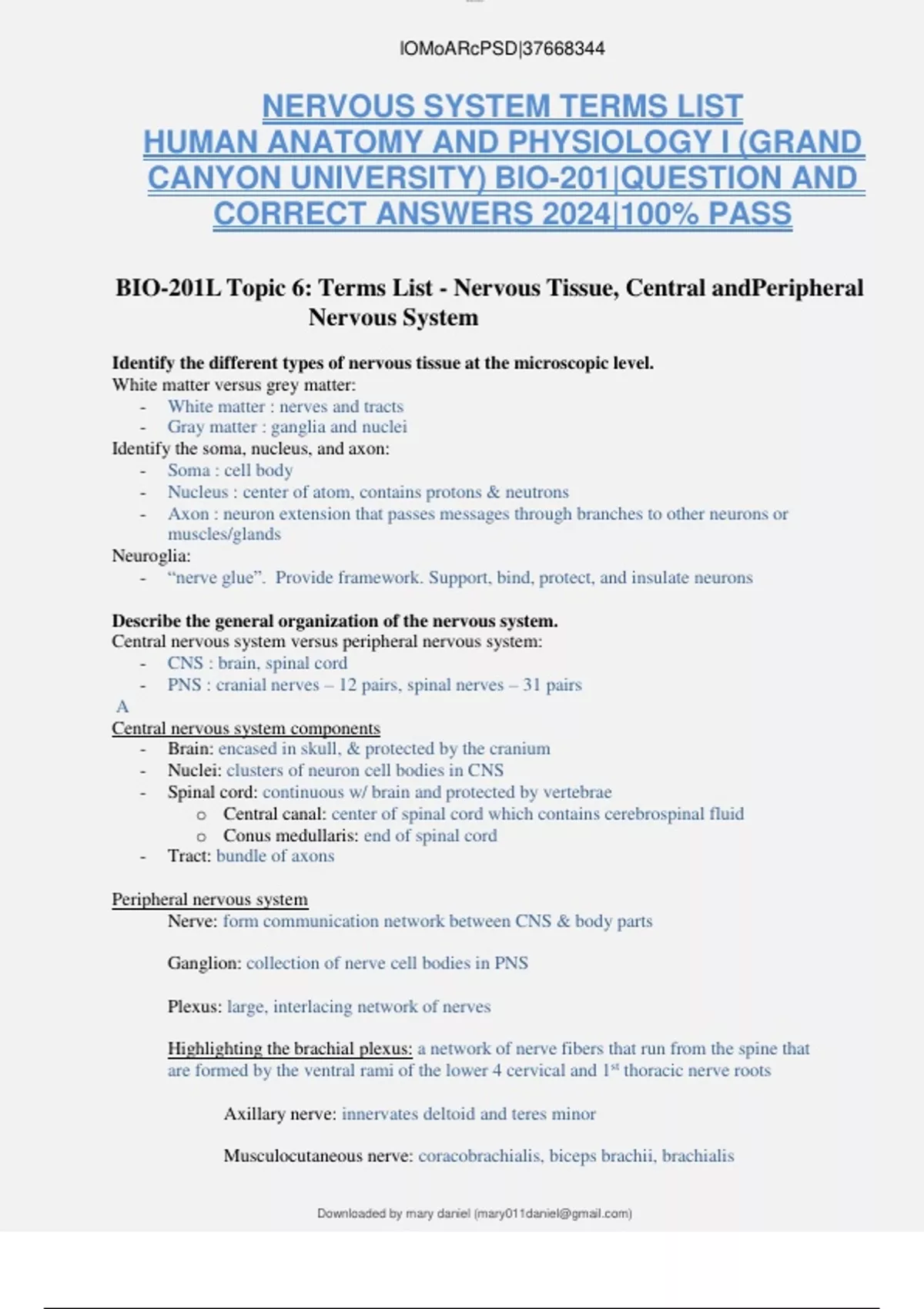 NERVOUS SYSTEM TERMS LIST HUMAN ANATOMY AND PHYSIOLOGY I (GRAND CANYON UNIVERSITY) BIO-201|QUESTION AND CORRECT ANSWERS 2024|100% PASS