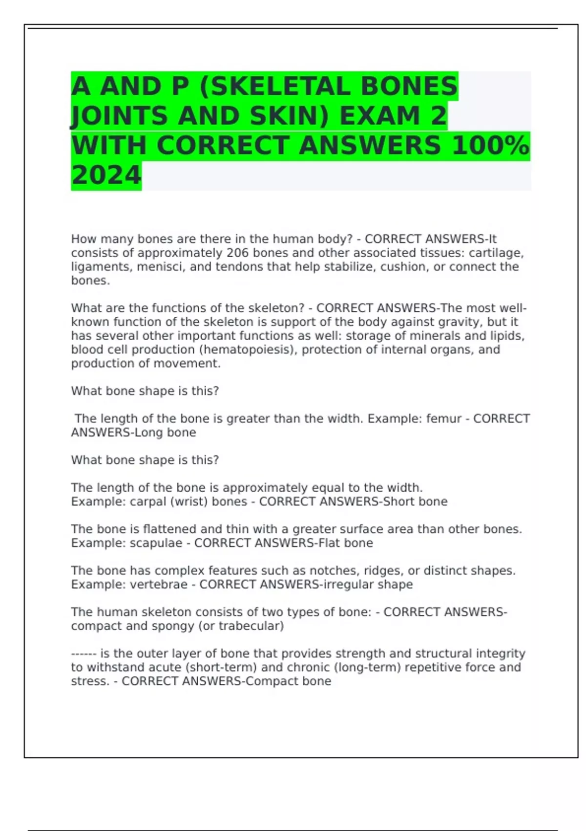 A AND P (SKELETAL BONES JOINTS AND SKIN) EXAM 2 WITH CORRECT ANSWERS 100% 2024