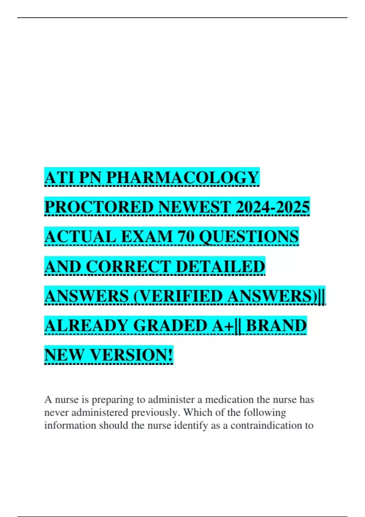 ATI PN PHARMACOLOGY PROCTORED NEWEST ACTUAL EXAM 70 QUESTIONS AND CORRECT DETAILED ANSWERS (VERIFIED ANSWERS)|| ALREADY GRADED A+|| BRAND NEW VERSION! A nurse is preparing to administer a medication the nurse has never administered previously. Which of the following information should the nurse identify as a contraindication to administering the medication?ANSWER-The client is allergic to a component of the medication. -The client is five years younger than the age requirements for the medication. A nurse is preparing to administer an IM dose of penicillin to a client who has a new prescription. The client states that they took penicillin 3 years ago, they developed a rash. Which action should the nurse take?ANSWER-Withhold the medication. A nurse is comparing a newly prescribed medication to a clients current medications. Which of the following interactions should the nurse identify as increasing the risk of medication toxicity?ANSWER-The new medication decreases the rate of metabolism of another medication. A nurse is caring for several clients who came to the clinic for a seasonal influenza immunization. The nurse should identify that which of the following clients is a candidate to receive the vaccine via nasal spray rather than an injection?ANSWER17- year-old who has a hypersensitivity to prenicillin A nurse is teaching a group of new guardians about immunizations. The nurse should instruct the guardians that the series for which of the following vaccines is completed prior to the first birthday?ANSWERrotavirus vaccine