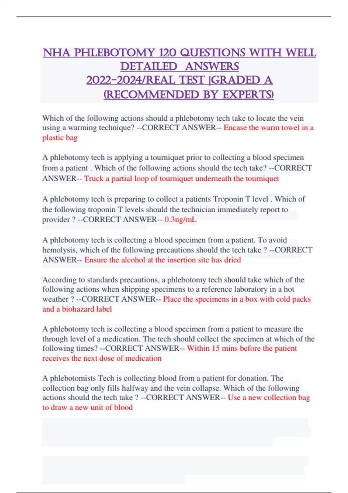 NHA PHLEBOTOMY 120 QUESTIONS WITH WELL DETAILED ANSWERS /REAL TEST |GRADED A (RECOMMENDED BY EXPERTS NHA PHLEBOTOMY 120 QUESTIONS WITH WELL DETAILED ANSWERS /REAL TEST |GRADED A (RECOMMENDED BY EXPERTS
