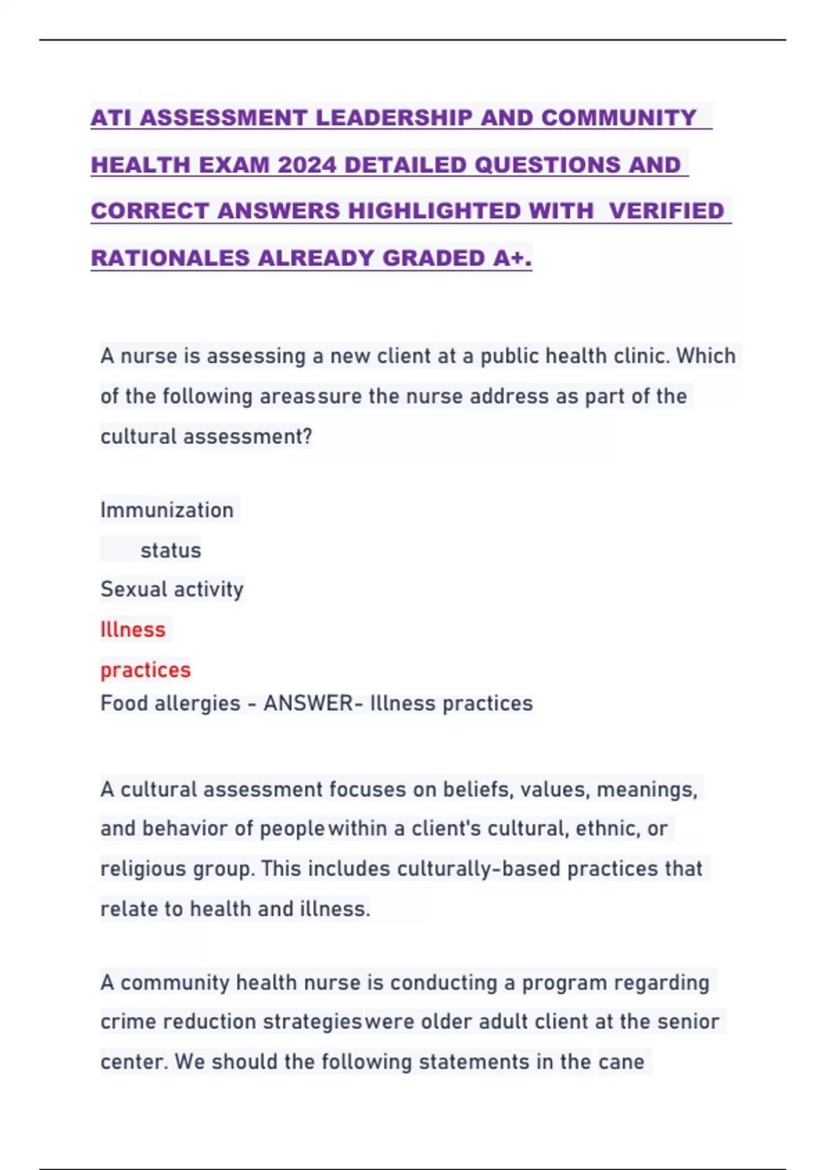 ATI ASSESSMENT LEADERSHIP AND COMMUNITY HEALTH EXAM 2024 DETAILED QUESTIONS AND CORRECT ANSWERS HIGHLIGHTED WITH VERIFIED RATIONALES ALREADY GRADED A+. A nurse is assessing a new client at a public health clinic. Which of the following areas sure the nurse address as part of the cultural assessment? Immunization status Sexual activity Illness practices Food allergies - ANSWER- Illness practices A cultural assessment focuses on beliefs, values, meanings, and behavior of people within a client's cultural, ethnic, or religious group. This includes culturally-based practices that relate to health and illness. A community health nurse is conducting a program regarding crime reduction strategies were older adult client at the senior center. We should the following statements in the cane understanding of information? -"When I am in my car, I will keep my personal items on the seat beside me." -"When I open my front door, I will ask for identification if the person is someone I do not know." -"I should store my purchases in the back seat when I am out shopping." -"I should remove the identification tag that is on my key ring." - ANSWER- -"I should remove the identification tag that is on my key ring." The nurse should inform the clients to remove any identification tag on their key ring. If keys are lost along with identifying information, then the client is left vulnerable to home invasions. A nurse is preparing a community education program about health care needs during pregnancy the nurse should include which of the following vaccines is safe to administer to a client who is pregnant? Herpes zoster Tetanus, diphtheria, pertussis (Tdap) Varicella Measles, mumps, and rubella - ANSWER- Tetanus, diphtheria, pertussis (Tdap