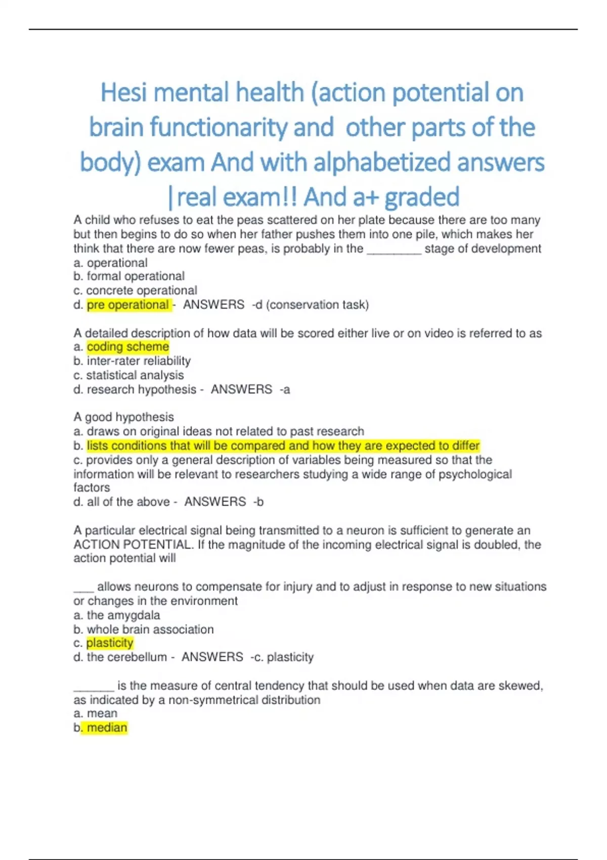 Hesi mental health (action potential on brain functionarity and other parts of the body) exam And with alphabetized answers |real exam!! And a+ graded