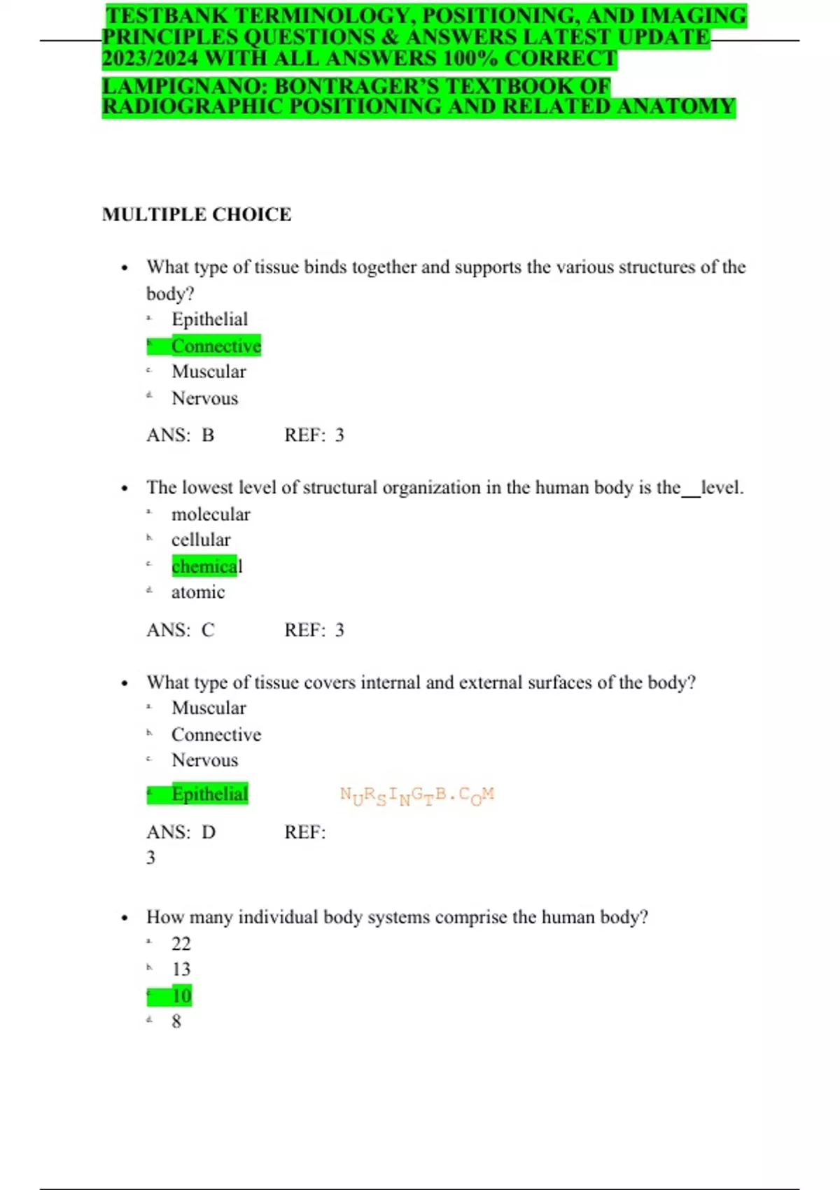 • What type of tissue binds together and supports the various structures of the body? a. Epithelial b. Connective c. Muscular d. Nervous ANS: B REF: 3 • The lowest level of structural organization in the human body is the level. a. molecular b. cellular c. chemical d. atomic ANS: C REF: 3 • What type of tissue covers internal and external surfaces of the body? a. Muscular b. Connective c. Nervous d. Epithelial ANS: D REF: 3 NURSINGTB.COM • How many individual body systems comprise the human body? a. 22 b. 13 c. 10 d. 8 ANS: C REF: 3 • Which system of the human body is responsible for the elimination of solid waste? a. Circulatory b. Respiratory c. Urinary d. Digestive ANS: D REF: 4 • Which of the following systems of the human body includes all ductless glands of the body? a. Endocrine b. Integumentary c. Muscular d. Glandular ANS: A REF: 6 • Which of the following body systems helps to regulate bod