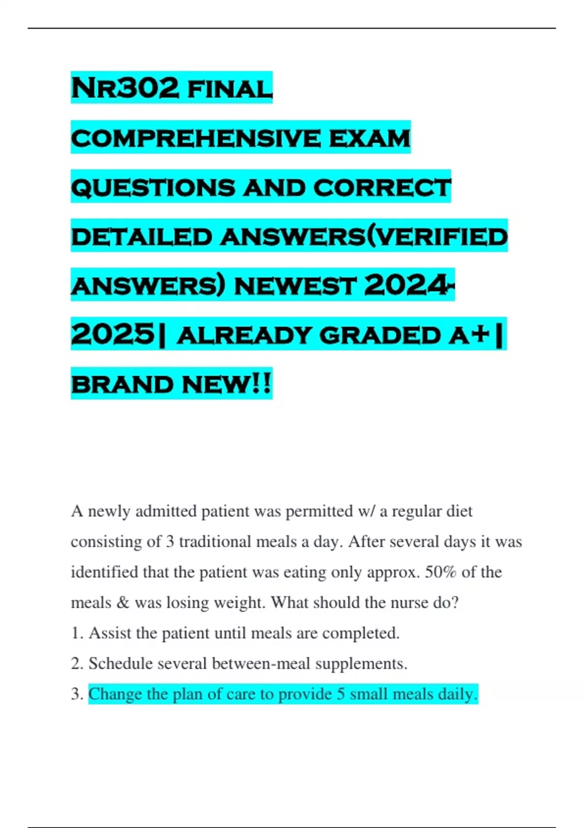 Nr302 final comprehensive exam questions and correct detailed answers(verified answers) newest 2024- 2025| already graded a+| brand new!! A newly admitted patient was permitted w/ a regular diet consisting of 3 traditional meals a day. After several days it was identified that the patient was eating only approx. 50% of the meals & was losing weight. What should the nurse do? 1. Assist the patient until meals are completed. 2. Schedule several between-meal supplements. 3. Change the plan of care to provide 5 small meals daily. 4. Secure an order to increase the # of calories provided.ANSWER3. Change the plan of care to provide 5 small meals daily. Rationale: Arranging for the 5 small meals daily is an interdependent nursing intervention. The primary HCP ordered a regular diet & the nurse is providing this diet over 5 meals a day rather than the traditional 3 meals a day. Small, frequent feedings spread the meals throughout the day & provide a volume that is not as overwhelming as a full meal. A patient has just returned from the operating room w/ a urinary retention (Foley) catheter, an IV line, & an oral airway & is still unresponsive. Which nursing assessment should be made first? 1. Check the surgical dressing to ensure that it's intact. 2. Confirm the placement of the oral airway. 3. Observe the Foley catheter for drainage. 4. Examine the IV site for infiltration.ANSWER2. Confirm the placement of the oral airway.