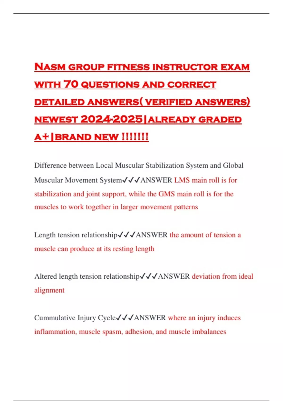 Nasm group fitness instructor exam with 70 questions and correct detailed answers( verified answers) newest |already graded a+|brand new !!!!!!! Difference between Local Muscular Stabilization System and Global Muscular Movement SystemANSWER LMS main roll is for stabilization and joint support, while the GMS main roll is for the muscles to work together in larger movement patterns Length tension relationshipANSWER the amount of tension a muscle can produce at its resting length Altered length tension relationshipANSWER deviation from ideal alignment Cummulative Injury CycleANSWER where an injury induces inflammation, muscle spasm, adhesion, and muscle imbalances How do you get out of the cumulative injury cycleANSWER corrective flexibility training, mixing up fitness routines How would a trainer monitor HR?ANSWER Count # of beats in 60 sec, count # of beats in 10 sec and multiply that # by 6, during exercise you count # of beats in 6 sec and multiply that by 10 Where is the ideal location to measure pulse on clientANSWER radial pulse SA NodeANSWER Specialized area of cardiac tissue located in the right atrium of the heart that initiates the electrical impulses that determines the hearts rate AV NodeANSWER Receives the electrical impulses from the SA node and directs them to the walls of the ventricles When an instructor stands with proper posture, wears professional clothing, and energetically engages with the class, what is she demonstrating?ANSWER-presence