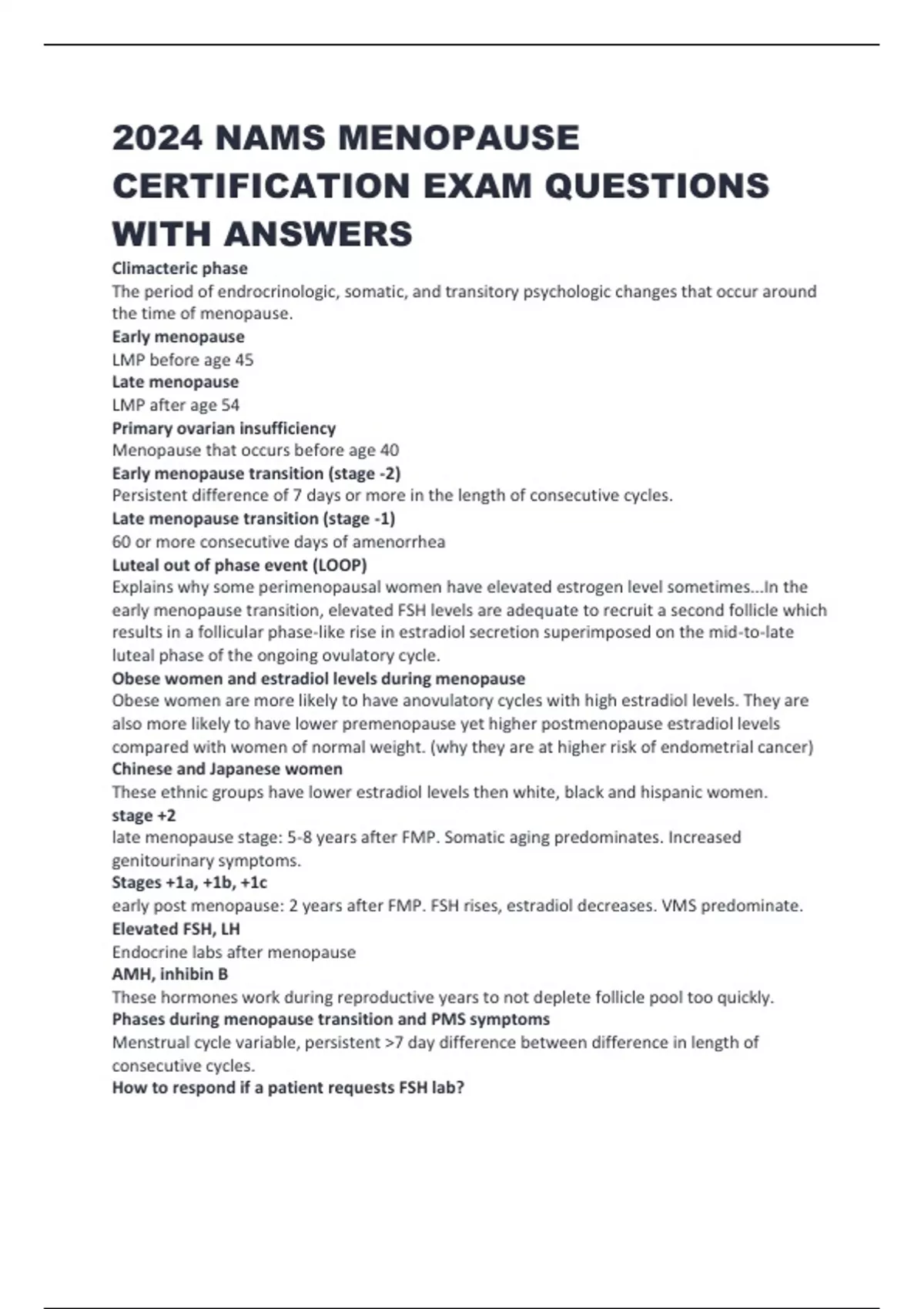 2024 NAMS MENOPAUSE CERTIFICATION EXAM QUESTIONS WITH ANSWERS Climacteric phase The period of endrocrinologic, somatic, and transitory psychologic changes that occur around the time of menopause. Early meno pause LMP before age 45 Late menopause LMP after age 54 Primary ovarian insufficiency Menopause that occurs before age 40 Early menopause transition (stage -2) Persistent difference of 7 days or more in the length of consecutive cycles. Late menopause transition (stage -1) 60 or more consecutive days of amenorrhea Luteal out of phase event (LOOP) Explains why some perimenopausal women have elevated estrogen level sometimes...In the early menopause transition, elevated FSH levels are adequ ate to recruit a second follicle which results in a follicular phase -like rise in estradiol secretion superimposed on the mid -to-late luteal phase of the ongoing ovulatory cycle. Obese women and estradiol levels during menopause Obese women are more likely to have anovulatory cycles with high estradiol levels. They are also more likely to have lower premenopause yet higher postmenopause estradiol levels compared with women of normal weight. (why they are at higher risk of endometrial cancer) Chinese and Jap anese women These ethnic groups have lower estradiol levels then white, black and hispanic women. stage +2 late menopause stage: 5 -8 years after FMP. Somatic aging predominates. Increased genitourinary symptoms. Stages +1a, +1b, +1c early post menopause: 2 years after FMP. FSH rises, estradiol decreases. VMS predominate. Elevated FSH, LH Endocrine labs after menopause AMH, inhibin B These hormones work during reproductive years to not deplete follicle pool too quickly. Phases during menopause transition and PMS symptoms Menstrual cycle variable, persistent >7 day difference between difference in length of consecutive cycles. How to respond if a patient requests FSH lab? many pitfalls, variable depending on the day of the cycle you draw the lab, normal or low FSH is not helpful. The potentially superior marker of menopause, a lab. AMH DHEA (dehydroepiandrosterone) Adrenal androgens: precursor hromones produced by the adrenal gland that are enzymatically converted to active androgens or estrogens in peripheral tissues. Location of estrogen receptors Vagina, vulva, urethra, trigone of the bladder Effects of estrogen on tissue maintain blood flow, the collagen, and HA within the epithelial surfaces. Supports microbiome which s upports acidity of vagina and protects tissue from pathogens. Vaginal changes with menopause Thinning, loss of elasticity, loss or absence or rugae. Vagina and urethra in menopause vagina narrows, urethra moves closer to the introitus. Stress urinary incon tinence Vaginal estrogen and urinary incontinence: what type does it help with? Treatment for FPHL Minoxidil, spironolactone, finasteride, estrogen therapy Late reporoductive years -3b and -3a. What happens with menstrual cycles, FSH, AMH, AFC, inhibin? -3b: menstrual cycles normal, FSH normal, AMH low, AFC low, inhibin low. -3a: subtle menstrual changes, variable FSH, AMH low, AFC low, inhibin low. When it is appropriate to check an FSH during the cycle if you check it? and why? Cycle day #3. Elevated est radiol can suppress FSH giving a falsely normal FSH level. AMH produced by... used to test... Is it a screening tool for fertility? When does it peak? produced by granulosa cells used to test damage to ovarian follicle reserve. If AMH is low, the woman has a low ovarian reserve. not recommended as a screening tool to predict fertility. Peaks at around 25 years old. So before age 25, this test is not helpful. It is influenced by exogenous hormones. Lower in hormonal contraception users, but increases after d/cing. AFC Antral follicle count Number of follicles that are detectable with ultrasound. They are sensitive to FSH and considered to represent the availability pool of follicl es. Late menopause transition ( -1) FSH level on random draw 25 or higher Black women have higher or lower FSH levels? Higher Chinese and Japanese women have higher or lower estradiol levels compared to white, black and hispanic women? lower Menopause trans ition -changes in SHBG and testosterone? ratio? SHBG decreases Testosterone/SHBG ratio increases by 80%. Testosterone/SHGB ratio is called what? The free androgen index What stage are VMS more likely? +1b (generally last 2 years) What hormone is generally h igher in obese women? Estrone -via aromatization. The postmenopausal ovary continues to produce what two hormones? testosterone and androstenedione Surgical menopause causes women to have lower levels of what hormone? testosterone. 40 -50% lower than in wome n w/ intact ovaries. Driving piece of menopause is ovarian follicles depleting. What does this do to the inhibin B and AMH? inhibin and AMH decrease therefore, follicle growth is not restrained, this allows for the growth of the remaining, diminished foll icle pool. In the menopause transition, women spend more time in what phase? Luteal -more PMS symptoms, more frequent menstrual periods. HPO axis theory and the menopause transition It is felt that the HPO axis may become less sensitive to estrogen, so even with good follicle growth and estradiol secretion, LH surges can fail which can lead to more cycle irregularity. In the first year after the FMP, there is no production of what hormone? progesterone What region of the adrenal gland secretes the androgens? zona reticularis what are considered the 'adrenal androgens'? DHEA, DHEAS, Androstenedione. Aldosterone secretion from the zona reticularis in the adrenal gland is regulated by 3 main factors. Angiotensin II, potassium concentration, adrenocorticotropic h ormone secreted by the anterior pituitary.