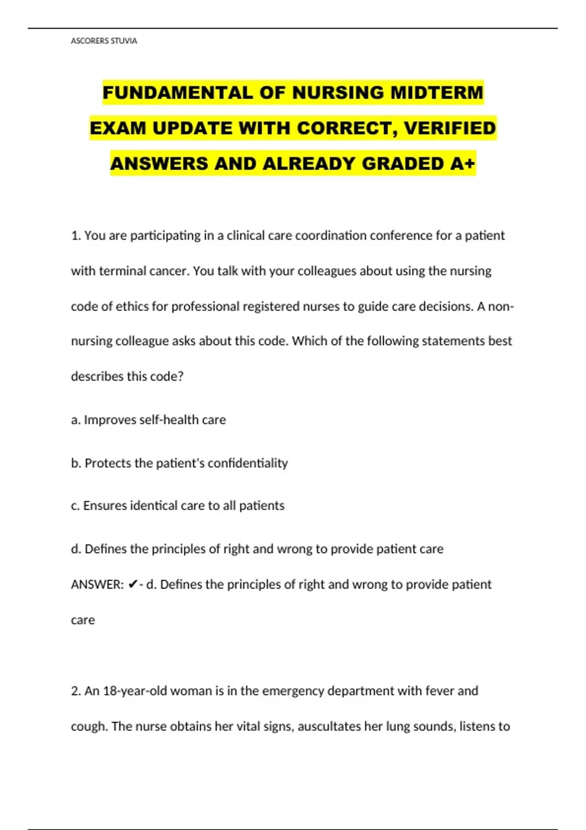 FUNDAMENTAL OF NURSING MIDTERM EXAM UPDATE WITH CORRECT, VERIFIED ANSWERS AND ALREADY GRADED A+ FUNDAMENTAL OF NURSING MIDTERM EXAM UPDATE WITH CORRECT, VERIFIED ANSWERS AND ALREADY GRADED A+