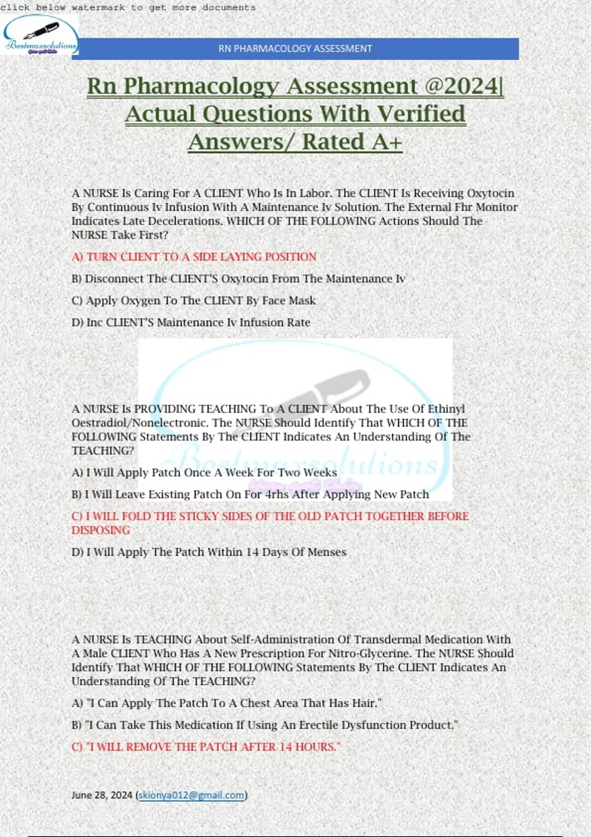 RN Pharmacology Assessment @2024| Actual Questions With Verified Answers/ Rated A+