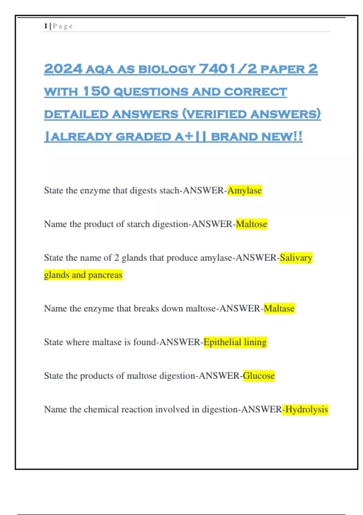 024 aqa as biology 7401/2 paper 2 with 150 questions and correct detailed answers (verified answers) |already graded a+|| brand new!! State the enzyme that digests stach-ANSWER-Amylase Name the product of starch digestion-ANSWER-Maltose State the name of 2 glands that produce amylase-ANSWER-Salivary glands and pancreas Name the enzyme that breaks down maltose-ANSWER-Maltase State where maltase is found-ANSWER-Epithelial lining State the products of maltose digestion-ANSWER-Glucose Name the chemical reaction involved in digestion-ANSWER-Hydrolysis