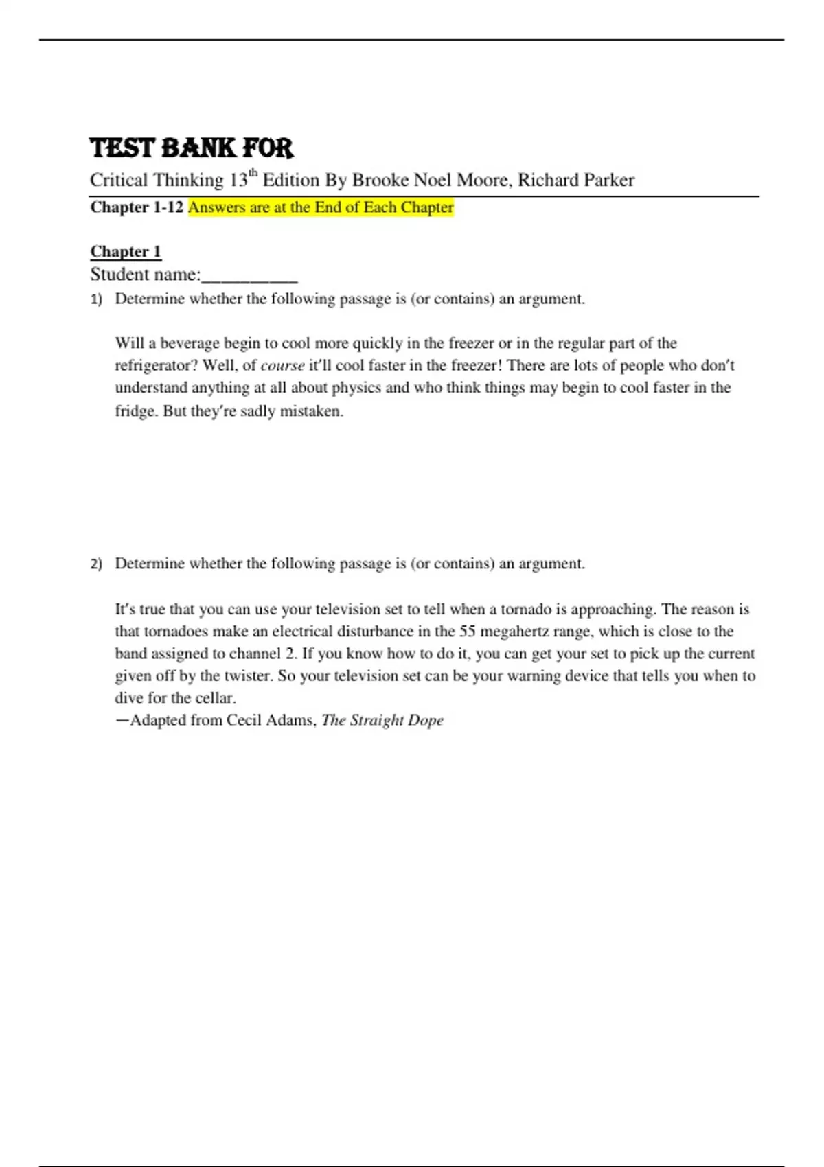 Test Bank For Critical Thinking 13th Edition By Brooke Noel Moore, Richard Parker Chapter 1-12