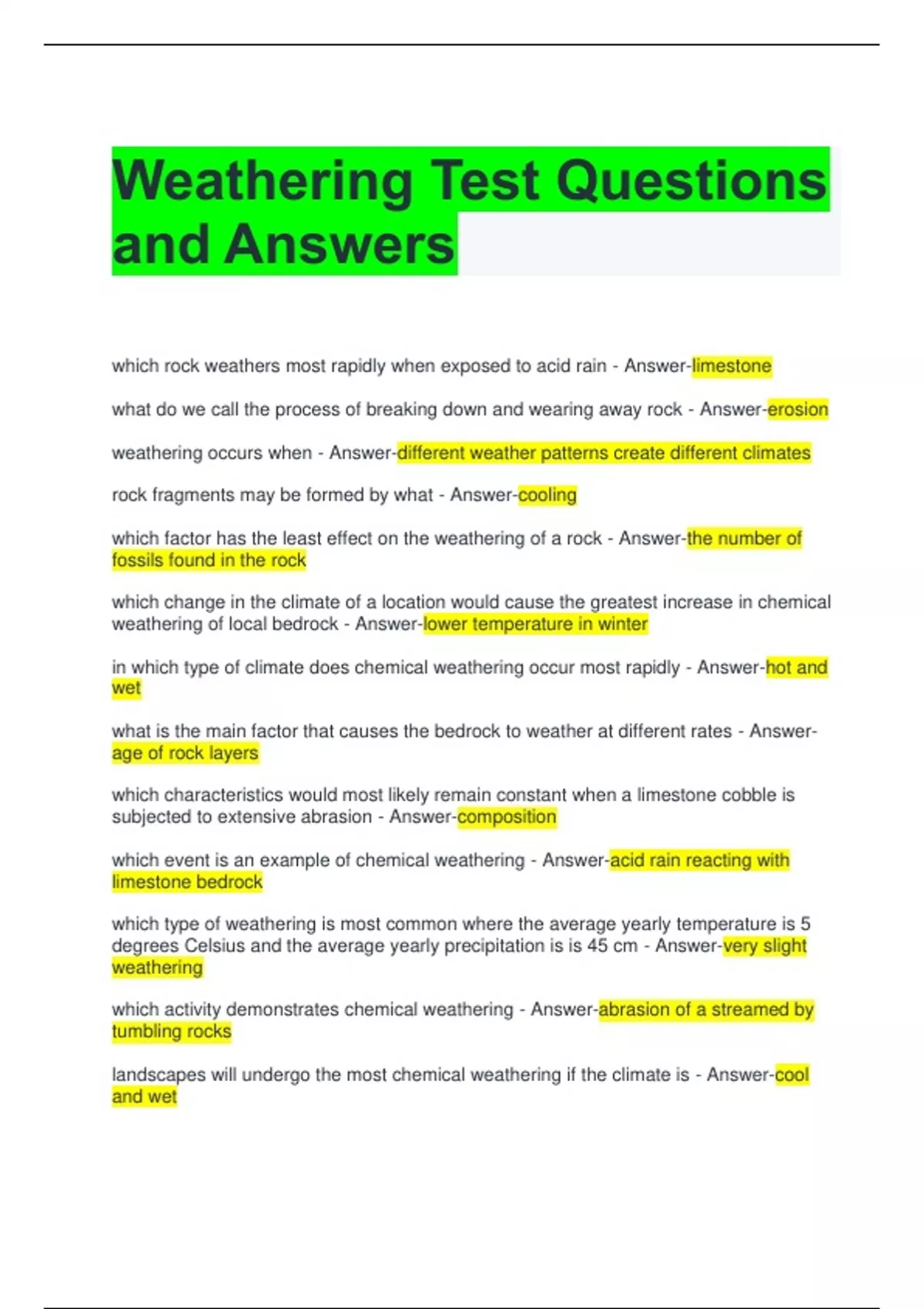 Weathering Test Questions and Answers which rock weathers most rapidly when exposed to acid rain - Answer-limestone what do we call the process of breaking down and wearing away rock - Answer-erosion weathering occurs when - Answer-different weather patterns create different climates rock fragments may be formed by what - Answer-cooling which factor has the least effect on the weathering of a rock - Answer-the number of fossils found in the rock which change in the climate of a location would cause the greatest increase in chemical weathering of local bedrock - Answer-lower temperature in winter in which type of climate does chemical weathering occur most rapidly - Answer-hot and wet what is the main factor that causes the bedrock to weather at different rates - Answer-age of rock layers which characteristics would most likely remain constant when a limestone cobble is subjected to extensive abrasion - Answer-composition