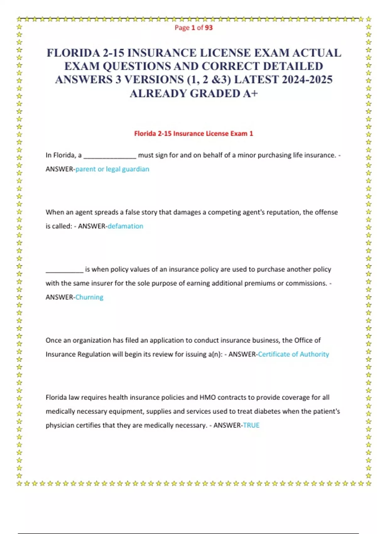 FLORIDA 2-15 INSURANCE LICENSE EXAM ACTUAL EXAM QUESTIONS AND CORRECT DETAILED ANSWERS 3 VERSIONS (1, 2 &3) LATEST ALREADY GRADED A+