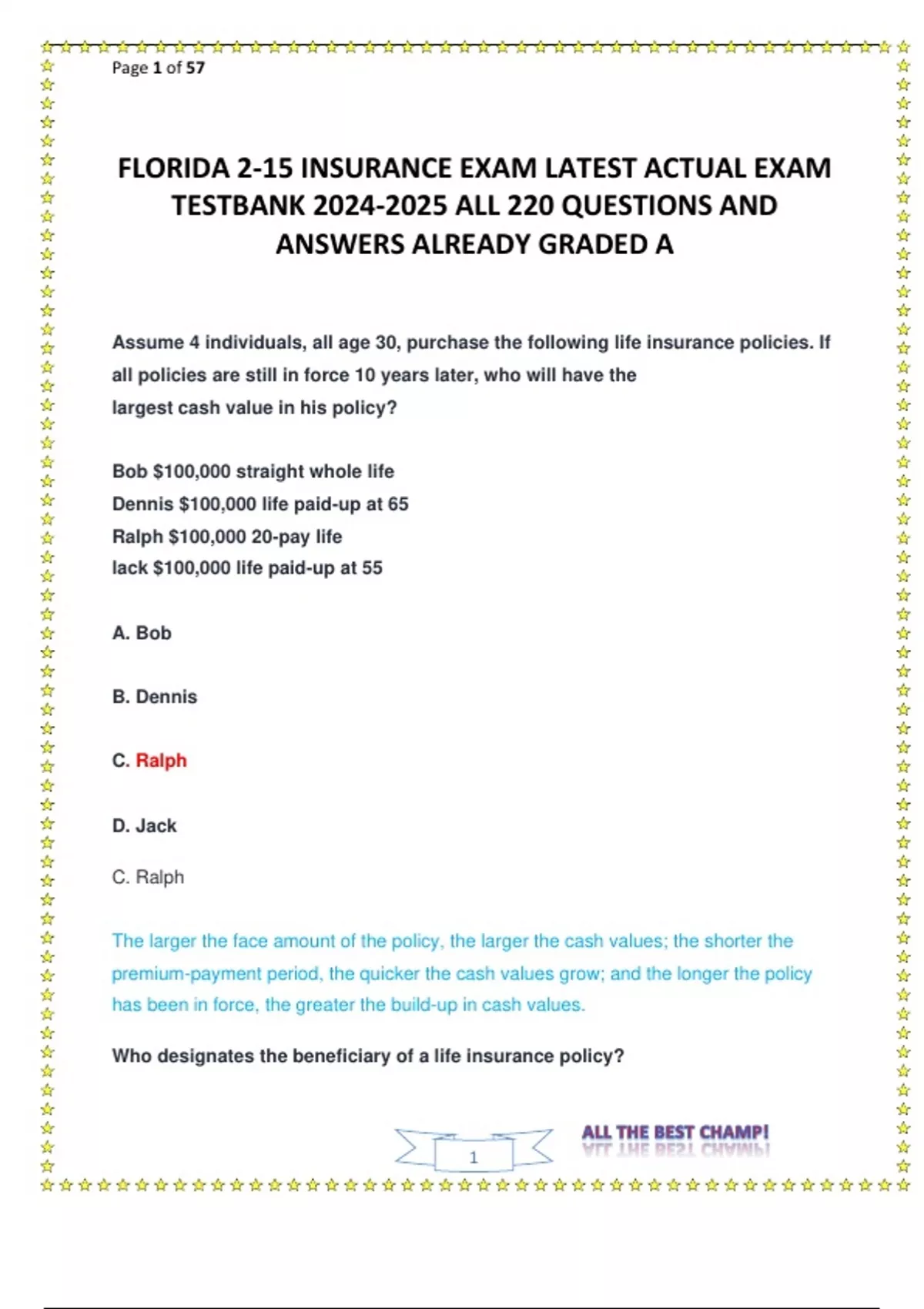 FLORIDA 2-15 INSURANCE EXAM LATEST ACTUAL EXAM TESTBANK ALL 220 QUESTIONS AND ANSWERS ALREADY GRADED A