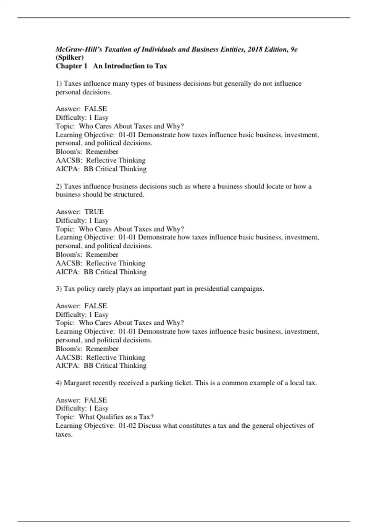 Test Item File- Practice Test Bank - Taxation of Individuals and Business Entities 2018 Edition,Spilker,9e