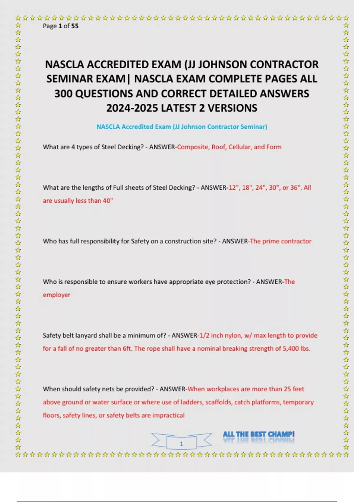 NASCLA ACCREDITED EXAM (JJ JOHNSON CONTRACTOR SEMINAR EXAM| NASCLA EXAM COMPLETE PAGES ALL 300 QUESTIONS AND CORRECT DETAILED ANSWERS LATEST 2 VERSIONS