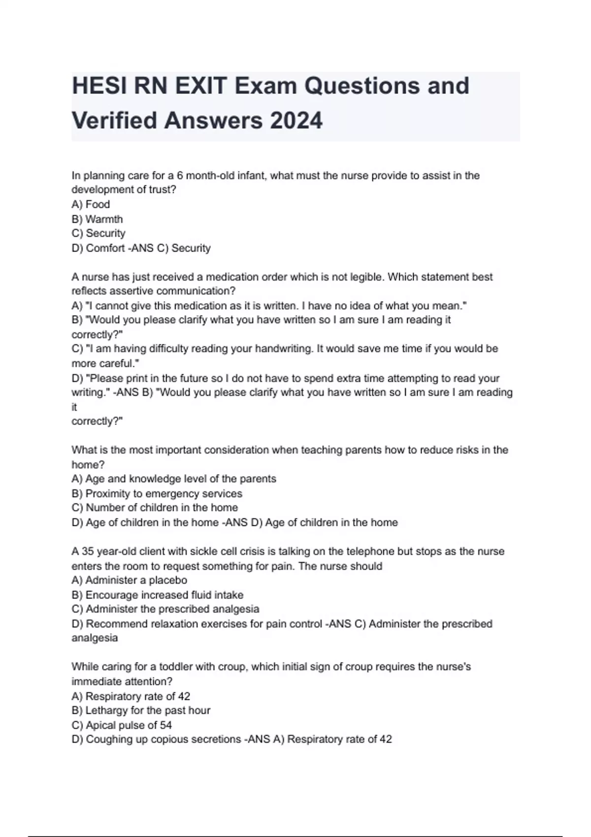 HESI RN EXIT Exam Questions and Verified Answers 2024