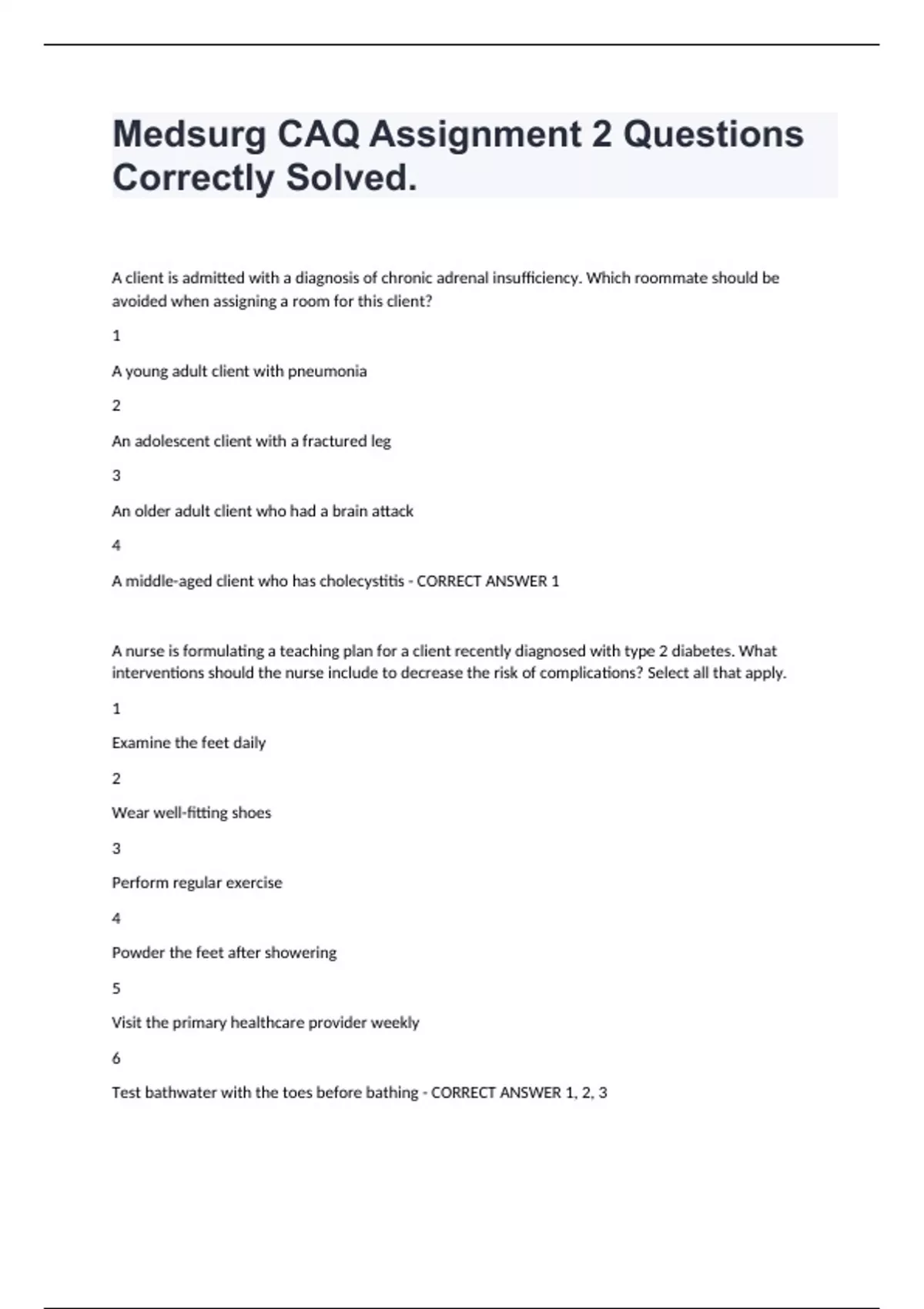 Medsurg CAQ Assignment 2 Questions Correctly Solved. A client is admitted with a diagnosis of chronic adrenal insufficiency. Which roommate should be avoided when assigning a room for this client? 1 A young adult client with pneumonia 2 An adolescent client with a fractured leg 3 An older adult client who had a brain attack 4 A middle-aged client who has cholecystitis - CORRECT ANSWER 1 A nurse is formulating a teaching plan for a client recently diagnosed with type 2 diabetes. What interventions should the nurse include to decrease the risk of complications? Select all that apply. 1 Examine the feet daily 2 Wear well-fitting shoes 3 Perform regular exercise 4 Powder the feet after showering 5 Visit the primary healthcare provider weekly 6 Test bathwater with the toes before bathing - CORRECT ANSWER 1, 2, 3 A nurse working in the diabetes clinic is evaluating a client's success with managing the medical regimen. What is the best indication that a client with type 1 diabetes is successfully managing the disease? 1 Reduction in excess body weight 2 Stabilization of the serum glucose 3 Demonstrated knowledge of the disease 4 Adherence to the prescription for insulin - CORRECT ANSWER 2 The nurse is teaching a client newly diagnosed with diabetes about the importance of glucose monitoring. Which blood glucose levels should the nurse identify as hypoglycemia? 1 68 mg/dL (3.8 mmol/L) 2 78 mg/dL (4.3 mmol/L) 3 88 mg/dL (4.9 mmol/L) 4 98 mg/dL (5.4 mmol/L) - CORRECT ANSWER 1 Which clinical manifestation is found in a client with a deficiency of adrenocorticotropic hormone? 1 Anovulation 2 Dehydration 3 Malaise and lethargy 4 Menstrual abnormalities - CORRECT ANSWER 3 A nurse is assessing a client with Cushing syndrome. Which signs should the nurse expect the client to exhibit? Select all that apply. 1 Hirsutism 2 Round face 3 Pitting edema 4 Buffalo hump 5 Hypoglycemia - CORRECT ANSWER 1, 2, 4 A client reports their lips feel thicker, as well as joint pain and coarse facial features. What should the nurse suspect as the cause of the anterior pituitary hyperfunction? 1 Excessive secretion of growth hormone 2 Excessive secretion of prolactin hormone 3 Excessive secretion of thyroid-stimulating hormone 4 Excessive secretion of adrenocorticotropic hormone - CORRECT ANSWER 1 Which statement does the nurse know is true regarding the effects of parathyroid hormone on bones for the maintenance of calcium balance?