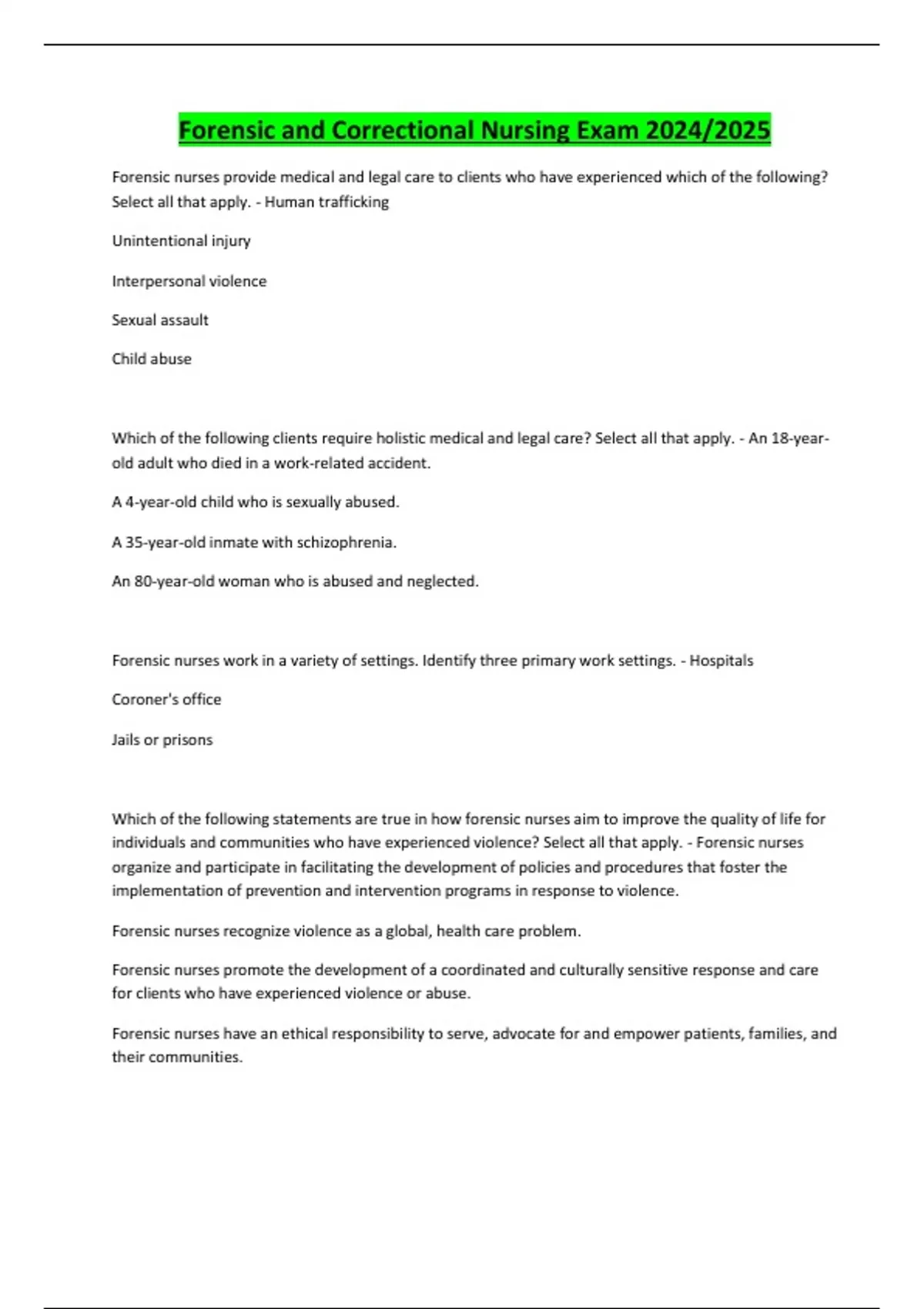 Forensic and Correctional Nursing Exam 2024/2025 Forensic nurses provide medical and legal care to clients who have experienced which of the following? Select all that apply. - Human trafficking Unintentional injury Interpersonal violence Sexual assault Child abuse Which of the following clients require holistic medical and legal care? Select all that apply. - An 18-yearold adult who died in a work-related accident. A 4-year-old child who is sexually abused. A 35-year-old inmate with schizophrenia. An 80-year-old woman who is abused and neglected. Forensic nurses work in a variety of settings. Identify three primary work settings. - Hospitals Coroner's office Jails or prisons Which of the following statements are true in how forensic nurses aim to improve the quality of life for individuals and communities who have experienced violence? Select all that apply. - Forensic nurses organize and participate in facilitating the development of policies and procedures that foster the implementation of prevention and intervention programs in response to violence. Forensic nurses recognize violence as a global, health care problem. Forensic nurses promote the development of a coordinated and culturally sensitive response and care for clients who have experienced violence or abuse. Forensic nurses have an ethical responsibility to serve, advocate for and empower patients, families, and their communities. CONTINUES....